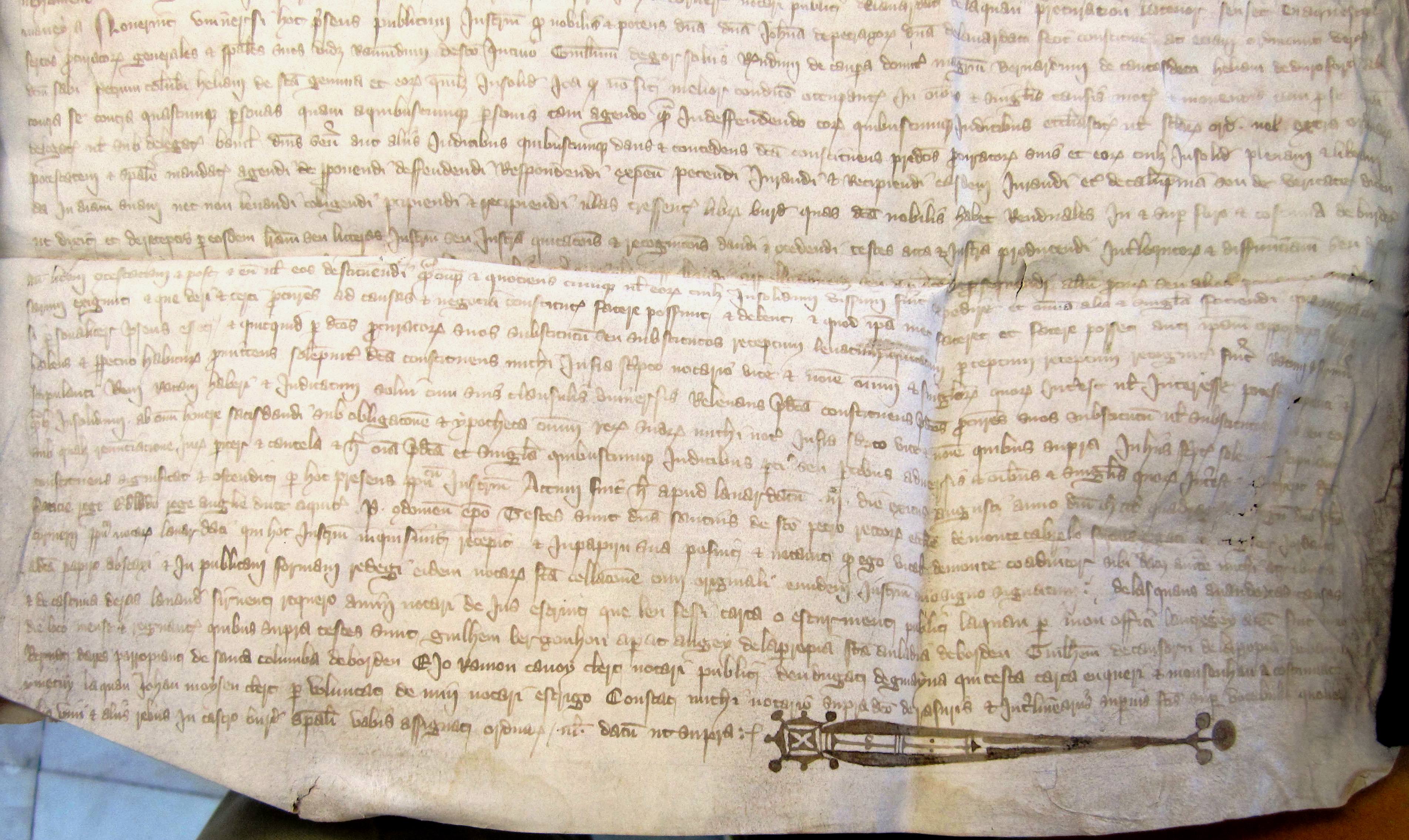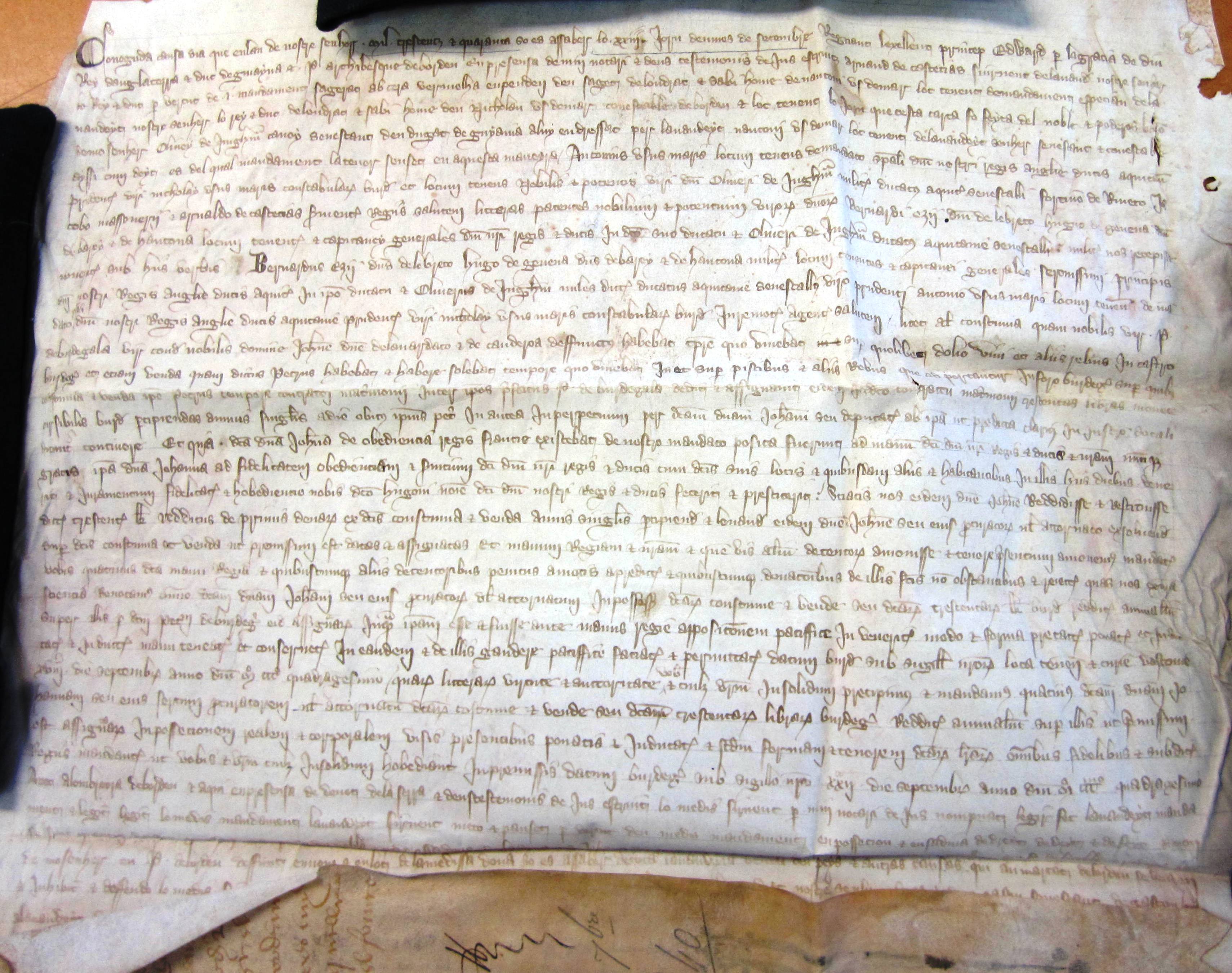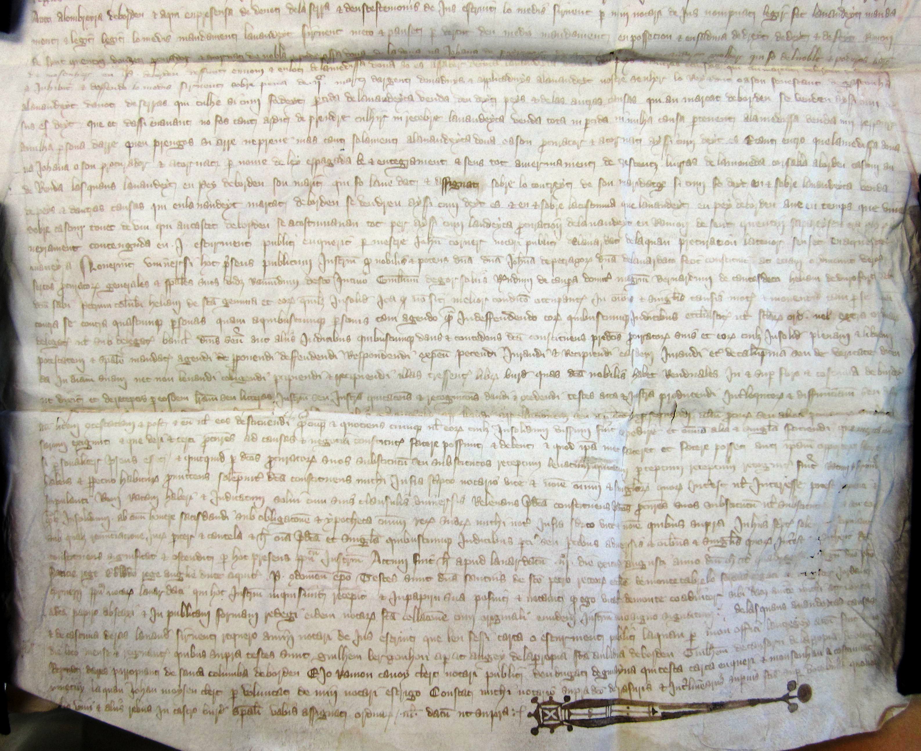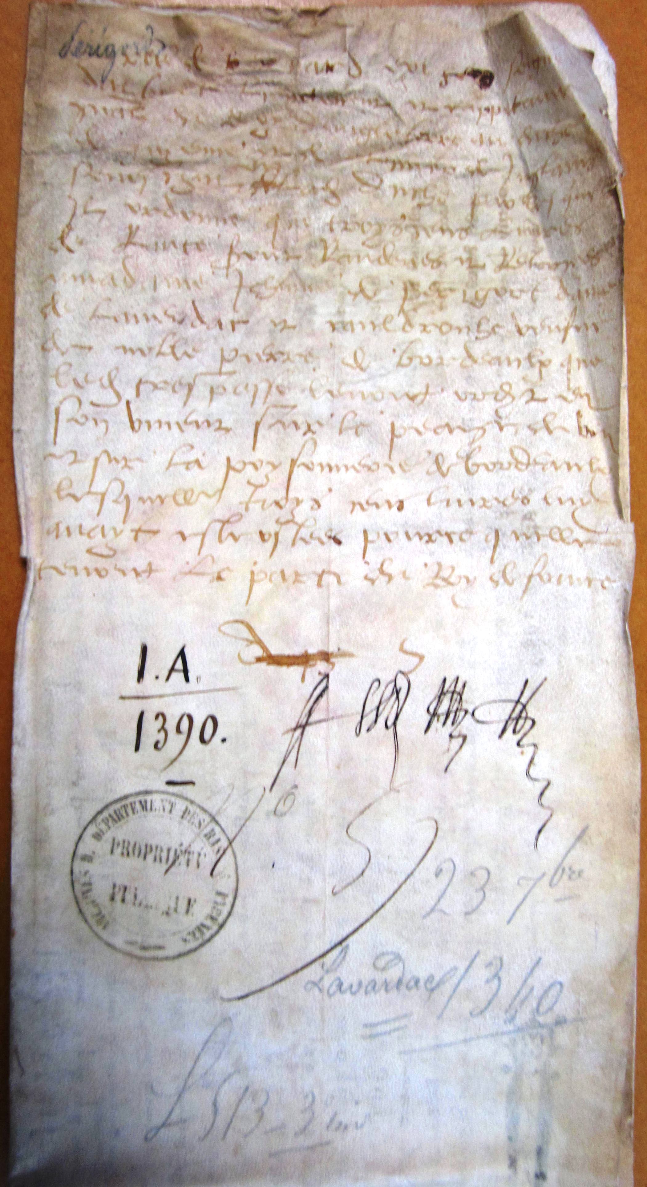 Assignation faite à noble Jeanne de Périgord, dame de Laverdac, etc., de 300 livres de rente, que Pierre de Bordeaux son mari lui avoit donné pour son douaire, à prendre sur le péage et coutume de Bordeaux. Le roi d’Angleterre avoit fait saisir ces 300 livres, parce qu’elle était du parti du roi de France (1340).