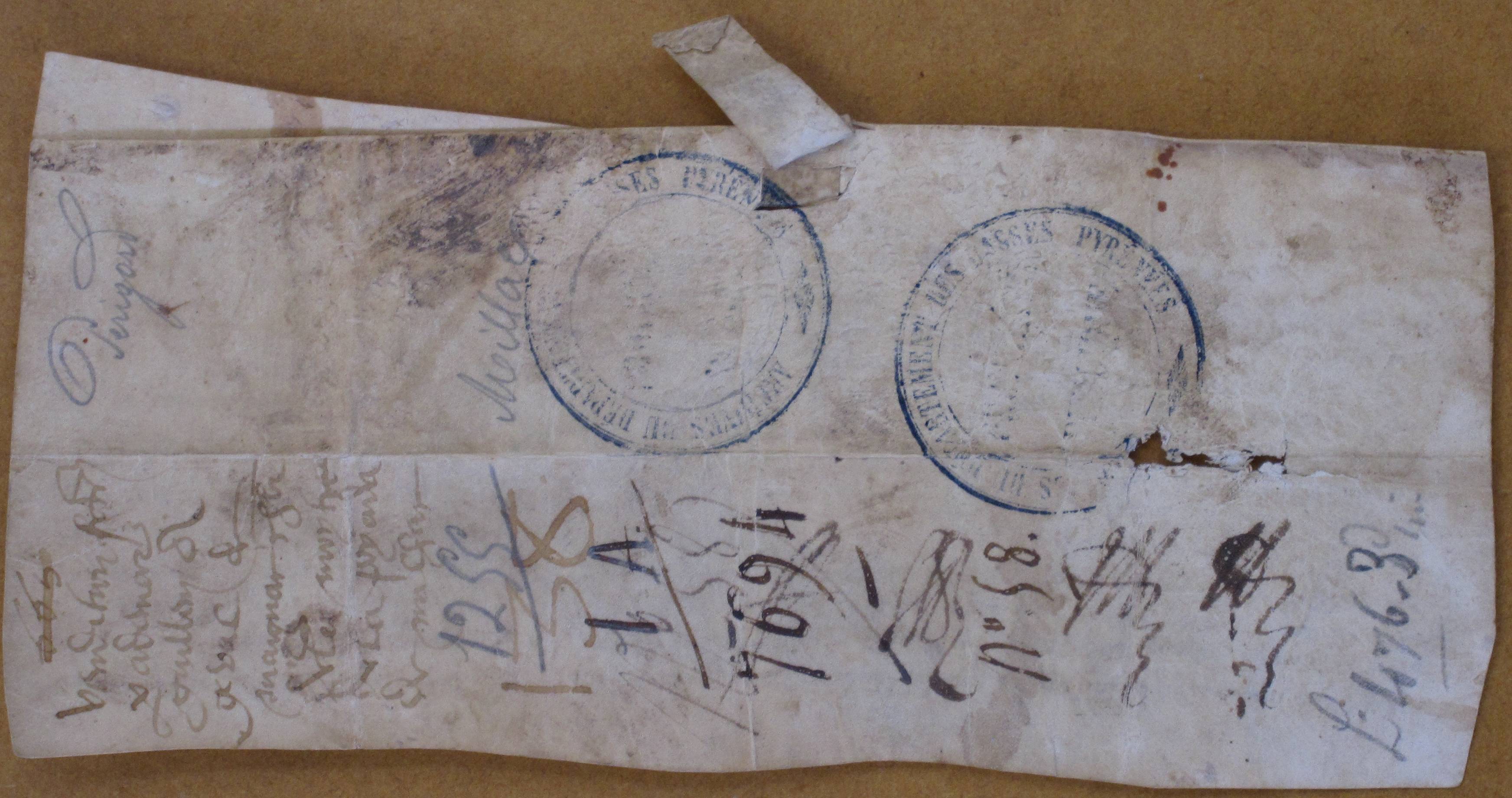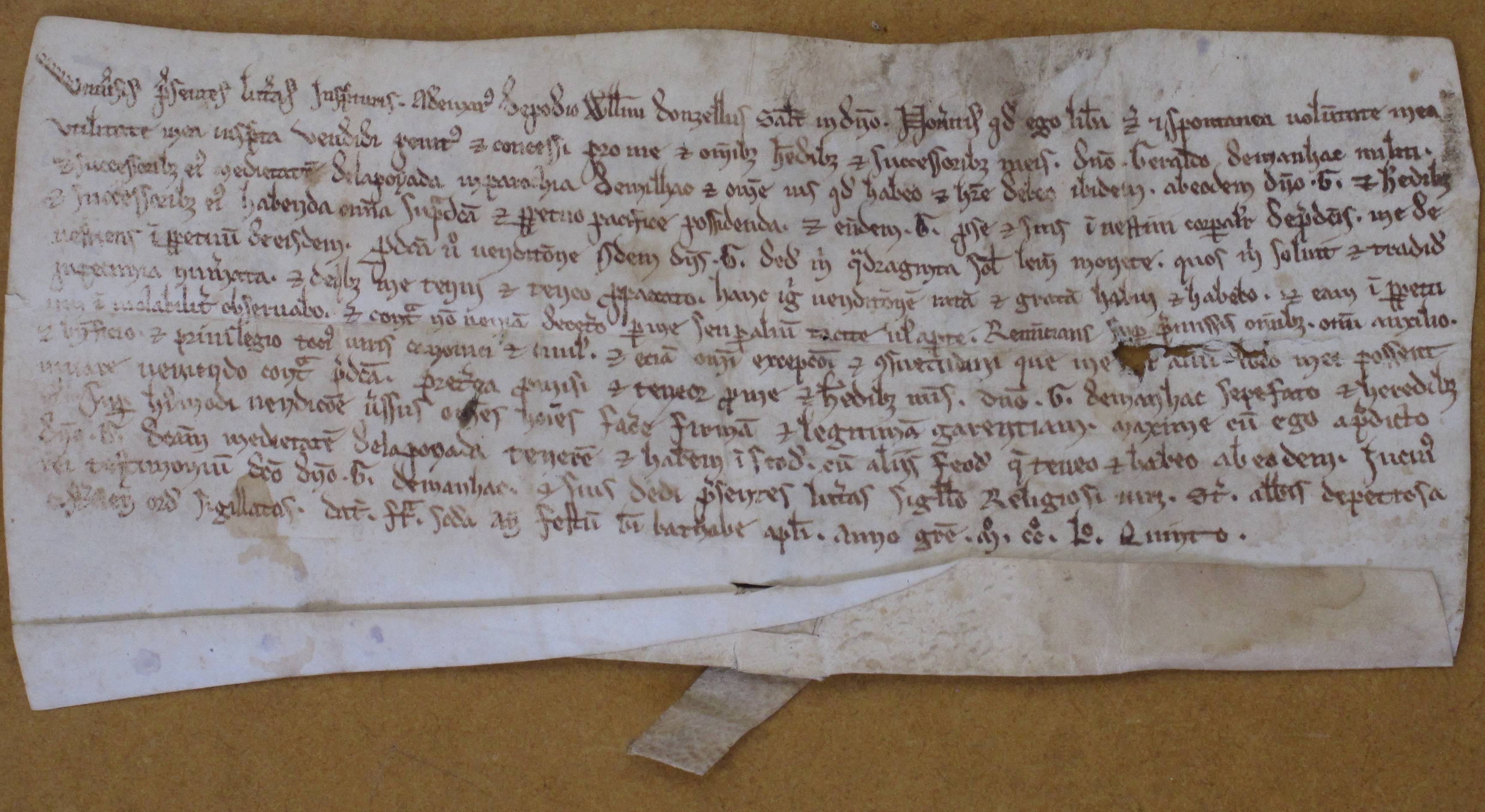 Universis presentes litteras inspecturis. Ademarus de Podio Willelmi, donzellus, salutem in Domino. Noveritis quod ego, libera et spontanea voluntate mea, voluntate mea inscripta vendidi penitus & concessi pro me et heredibus & successoribus meis, domino Geraldo de Manhac militi & successoribus eius medietatem de La Poyada in parrochia de Milhac & omne jus quod habeo & habere debeo ibidem ab eodem domino G. & heredibus & successoribus eius habenda omnia supradicta & perpetuo pacifice possidenda, & eidem G. pro se & suis investivi corporaliter de predictis, me devestiens in perpetuum de eisdem. Predicta vero venditione idem dominus G. dedit mihi quadraginta solidos lemovicen. monete quos mihi solvit & tradidit in pecunia numerata & de quibus me tenui & teneo propaccato. Hanc igitur venditione ratam & gratam habui & habebo, & eam in perpetuum inviolabiliter observabo, & contra non veniam de cetero per me seu per alium tacite vel aperte, renuncians, super premissis omnibus, omni auxilio & beneficio & privilegio totius iuris canonici & civili, & etiam omni exceptioni & consuetudini que me [manuscrit détérioré ici] possent iurare veniendo contra predicta. Preterea promisi & teneor pro me & heredibus meis, domino G. de Manhac sepefato & heredibus suis super hujusmodi venditione verssus omnes homines facere firmam & legitimam garentiam maxime, cum ego a predicto domino G. dictam medietatem de La Poyada tenerem & haberem in feodum cum aliis feodis que teneo & habeo ab eodem. In cuius rei testimonium dicto domino G. de Manhac & suis, dedi presentes litteras sigillo religiosi viri St(ephani) abbatis de Petrosa cistercen. ordinis sigillatas. Datum [-----] ante festum beati Barnabe apostoli, anno Gratie M° CC° L° quinto.
