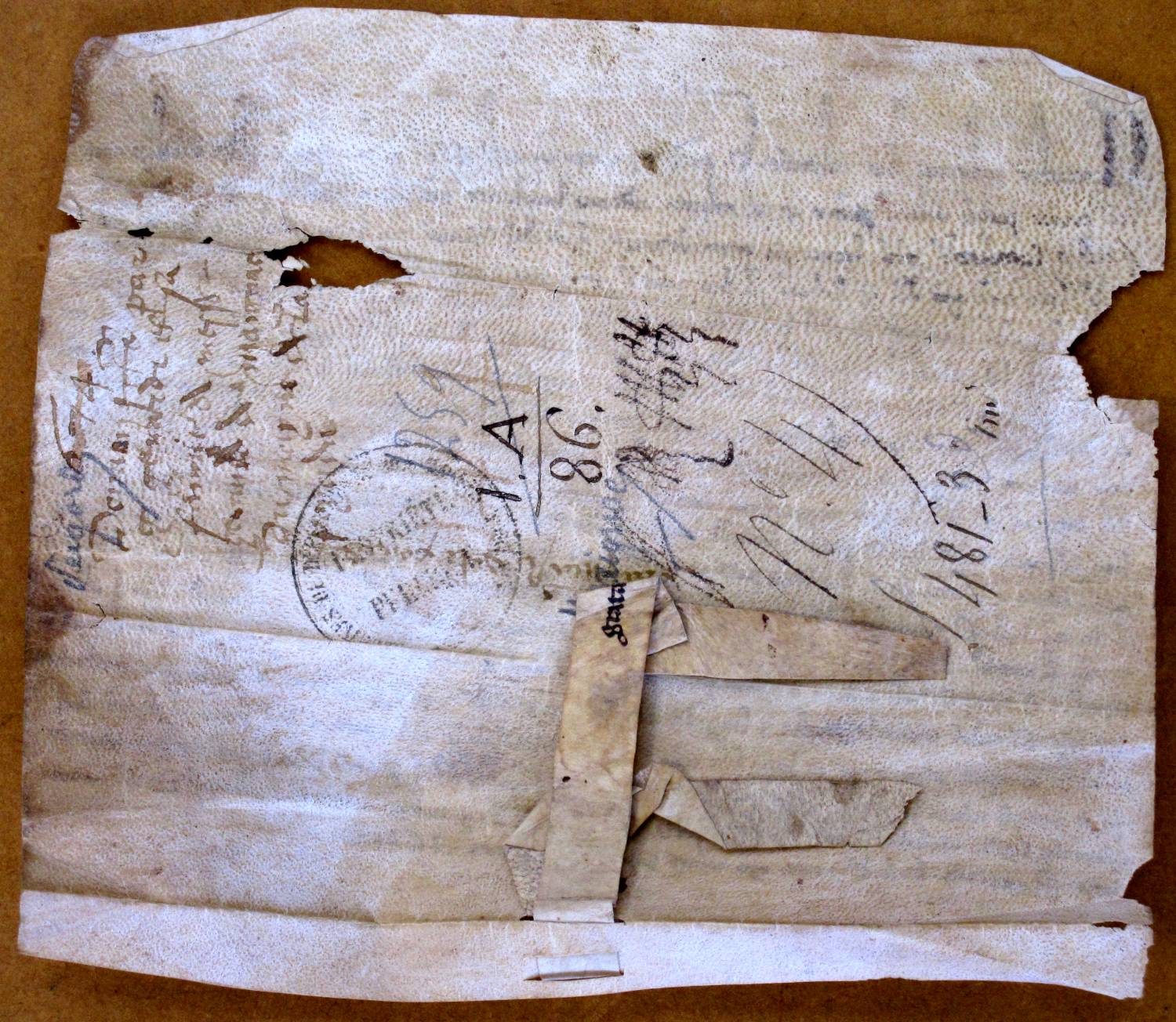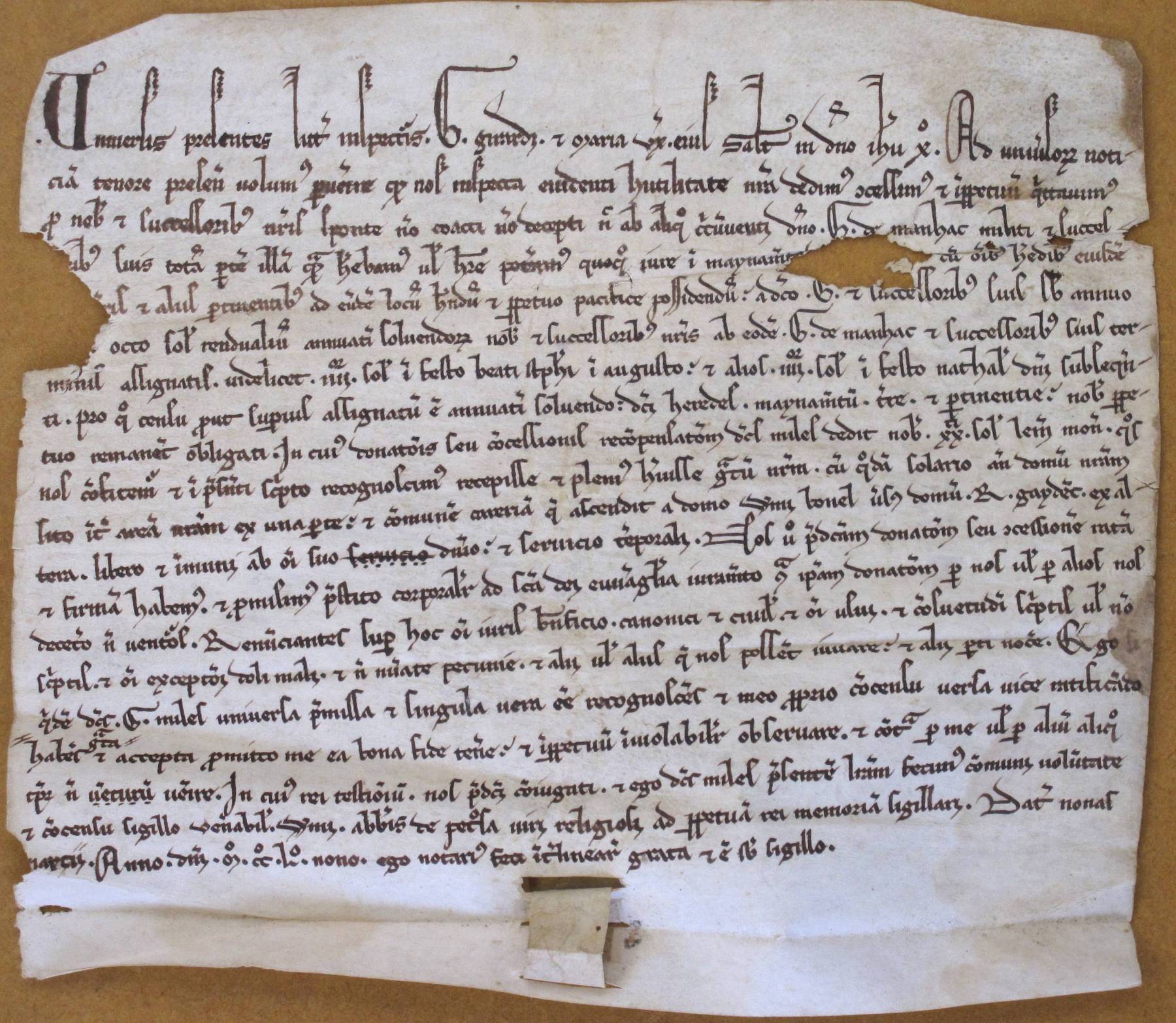 Universis presentes litteras inspecturis, G. Girardi & Maria uxor ejus salutem in Domino Jesu Xto. Ad universorum noticiam tenore present. volumus pervenire quod nos ruspecta evidenti hutilitate nostra dedimus, concessimus et in perpetuum quittammus pro nobis et successoribus nostris sponte non coacti, non decepti nec ab aliquo circumventi, domino G. de Manhac militi & successoribus suis totam presentem illam quam habemus vel habere poteramus quoque iure in maynament. [------] [1] cum omnibus heredibus eiusdem [------is] [2] & aliis pertinentibus ad eundem locum habendum & perpetuo pacifice possiddendum a dicto G. & successoribus suis sum anno [-------] [3] octo solidorum rendualium annuatim solvendorum nobis & successoribus nostris ab eodem G. de Manhac & successoribus suis terminum assignatis, videlicet IIIIor sol. in festo beati Stephani in augusto, & alios IIIIor sol. in festo Nathal. Domini subsequenti, pro quo censu prout superius assignatum est annuatim solvendo, dicti heredes maynamentum terre et pertinentie, nobis perpetuo remanent obligati. In cuius donationis seu concessionis recompensationem, dictus miles dedit nobis XXti sol. Lemovicens. monete quos nos confitemur et in presenti scripto recognoscimus recepisse & plenius habuisse, quantum nostrum cum quodam solario ante domum nostrum sito inter meam nostram ex una parte, & commune carrieram que ascendit a domo Willelmi Bonel usque domum R. Gaydenc ex altera. Libero & immune ab omni suo dominio, & servicio temporali. Nos vero predictam donationem seu sescionem ratam & firmam habemus, & promisimus prestito corporaliter ad Sancta Dei Evvangelia iuramento contra ipsam donationem per nos vel per alios nos de cetero non venturos. Renunciantes super hoc omni juris beneficio canonici & civil. & omni usus & consuetudini scriptis vel non scriptis & omni exceptioni, doli, mali & non numerate pecunie, & alii vel aliis qu. nos possent inuare & alii parti nocere. Ego siquidem dictus G. miles universa premissa & singula vera esse recognosceres & meo proprio concensu versa vice ratificando haberent gratia & accepta promitto me ea bona fide tenere & in perpetuum inviolabiliter observare, & contra per me vel per alium aliquo tempore non venturum venire. In cuius rei testimonium nos predicti conjugati et ego dictus miles presentem litteram fecimus communi voluntate & concensu sigillo venerabili Willelmi abbatis de Petrosa [4] viri religiosi ad perpetua rei memoria sigillari. Datum nonas martii, anno Domini M° CC° L° nono. Ego notarius fecit interlinear. grata & est sub sigillo.