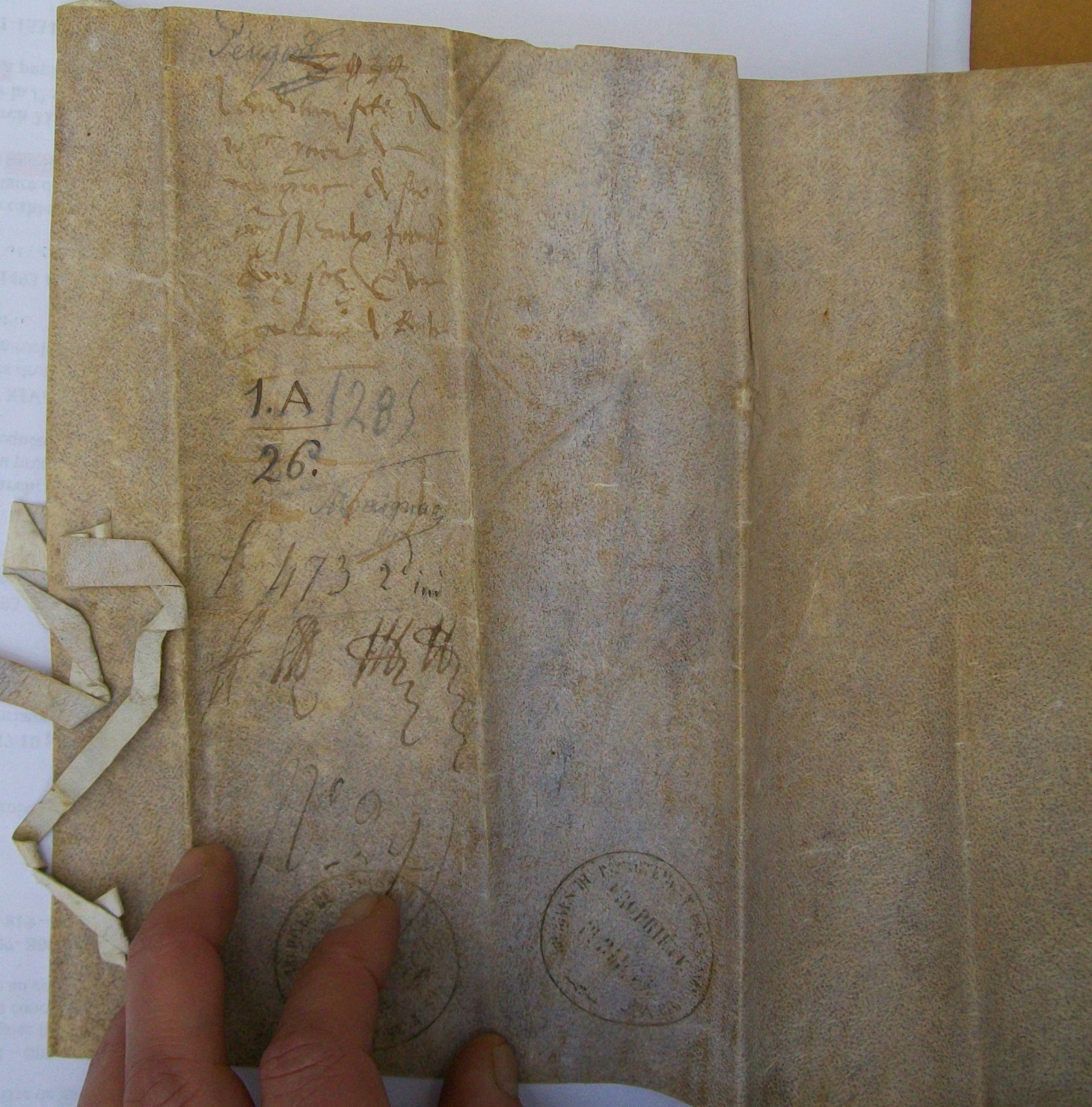 - document cotté n° 279 du chapitre 30 (Nontron) dans l'inventaire de Jean Fabre en 1546 (registre E 607 aux AD 64), avec le résumé suivant :" Vendition faite par Pierre Talabano à Guy de Magnac de 6 boisseaux froment, 10 sols et une géline de rente sur certaines pièces de terre situées l’une entre le chemin qui va de Varaignes à La Groulière et les terres de Pierre de Moustier et Géral Fabri de Trois Priotz, et l’autre entre le chemin que l’on va de la chapelle Saint-Roch vers Montberoulx et la terre de Ytier Le Peletier et la terre de Amblard Galtieri. Datée X kal. decembris AD 1285".