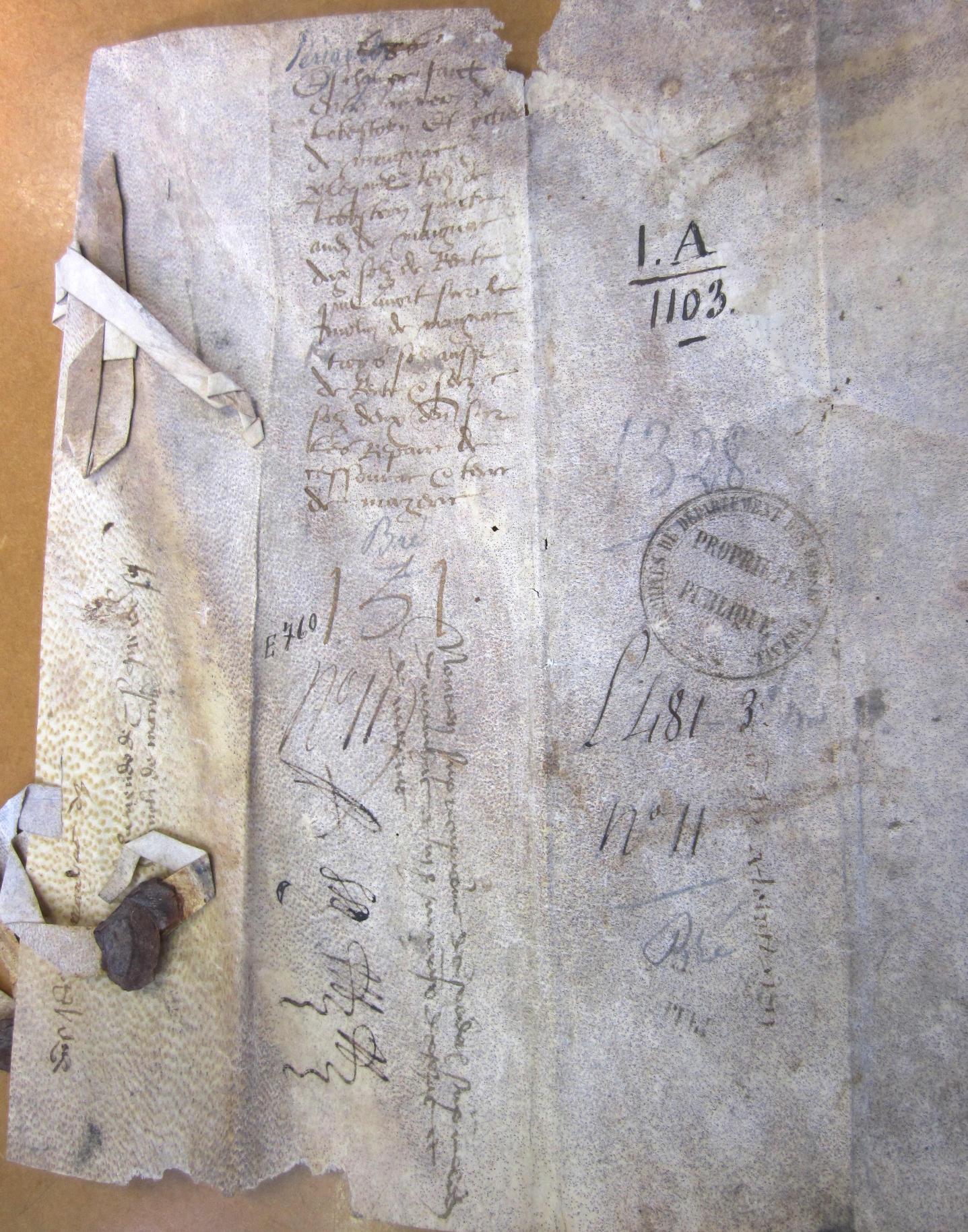 - document cotté n° 29 du chapitre 30 (Nontron) dans l'inventaire de Jean Fabre en 1546 (registre E 607 aux AD 64), avec le résumé ci-dessus.