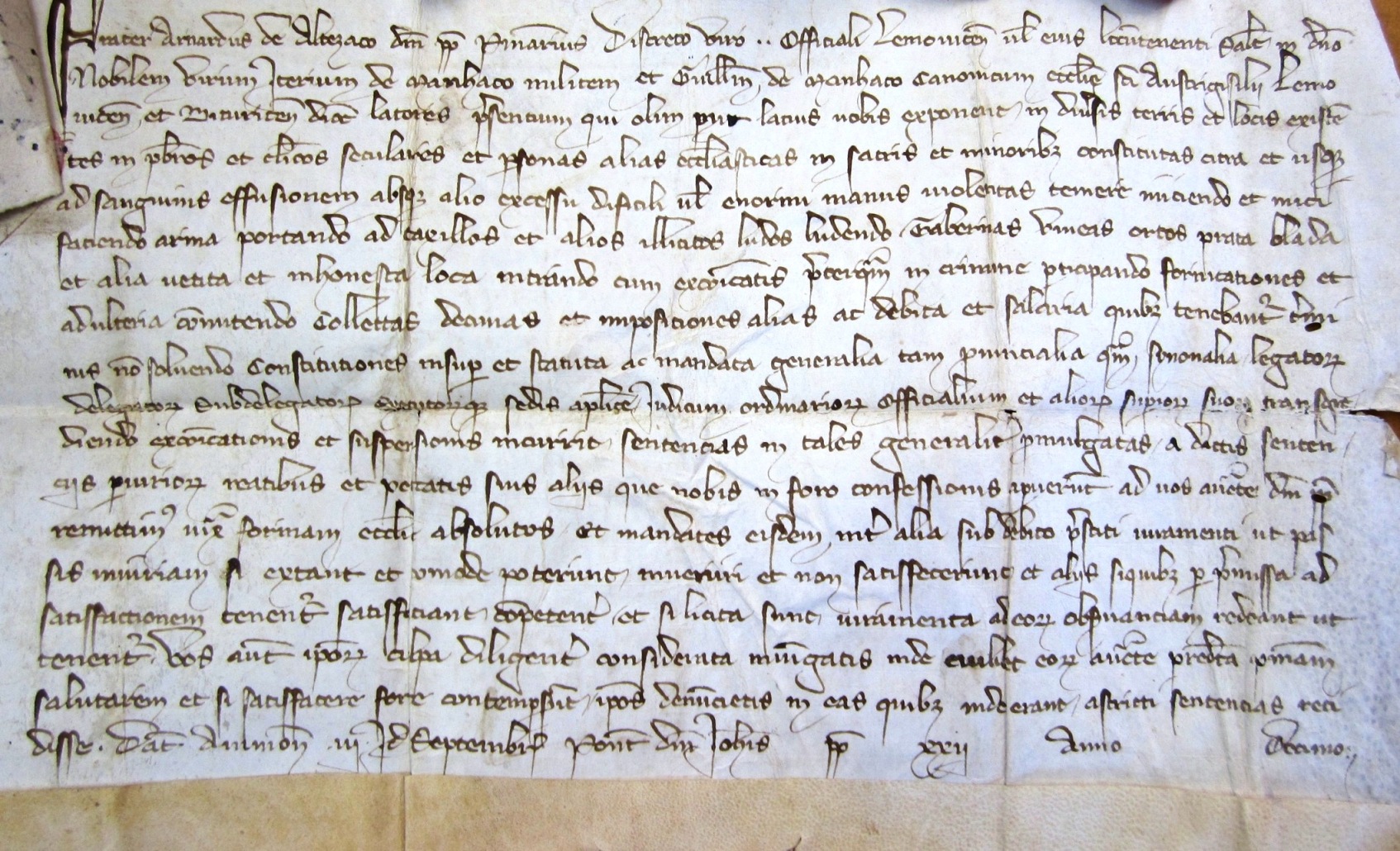 Frater Arnardus de Altezaco domini pape penitentiarius, discreto viro ... officiali lemovicens. vel eius locumteneti, salutem in Domino. Nobilem virum Iterium de Manhaco militem & Guillelmum de Manhaco canonicum ecclesie Austrigisilii lemovicens. et biturcens. dioces. latores presentium qui olim prout latius nobis exponent in diversis terris et locis existentes in presbiteros et clericos seculares et personas alias ecclesiasticas in fratris et minoribus constitutas citra et usque ad sanguinis effusionem absque alio excessu dif(f)icili vel enormi manus malentas temere mit(t)iendo et mit(t)i faciendo, arma portando ad taxillos et alios illiatos ludos ludendo tabernas, vineas ortos, prata, blada, et alia vetita et inhonesta loca intrando cum excommunicationis preterquam in crimine participando, fornicationes et adulteria commitendo, collectas decimas et impositiones alias ac debita et salaria quibus tenebantur terminis non solvendo constitutiones in super et statuta et mandata generalia tam provincialia quam synonalia legatorum, delegatorum, subdelegatorum executorumque sedis apostolice judicum ordinatiorum officialium et aliorum superiorum suorum transgrediendo excommunicationis et suspensionis incur(r)irit sententias in tales generaliter promulgatas a dattis sentenciis reatibus et peccatis suis aliisque nobis in foro confessionis aperverunt ad nos auctoritate domini pape remittimus iuxta formam ecclesie absolutos et mandates eisdem inter alia sub debito prestiti iuramenti ut passis iniuriam si extant et [--ade][1] poterunt mueriri[2] et non satisfecerunt et aliis siquibus per premissa ad satisfactionem tenentur, satisficiant competenter et si licita sunt iuramenta ad eorum observantiam redeant ut tenentur, vos autem ipsorum culpa diligenter considerata iniungatis inde cuilibet eorum auctoritate predicta penitentiam salutarem et si satisfacere fore contempserunt ipsos denuncietis in eas quibus inde erant astricti sententias recidisse. Datum Avinion. III id. septembris, pontificat. domini Johannis pape XXII, anno decimo[3].