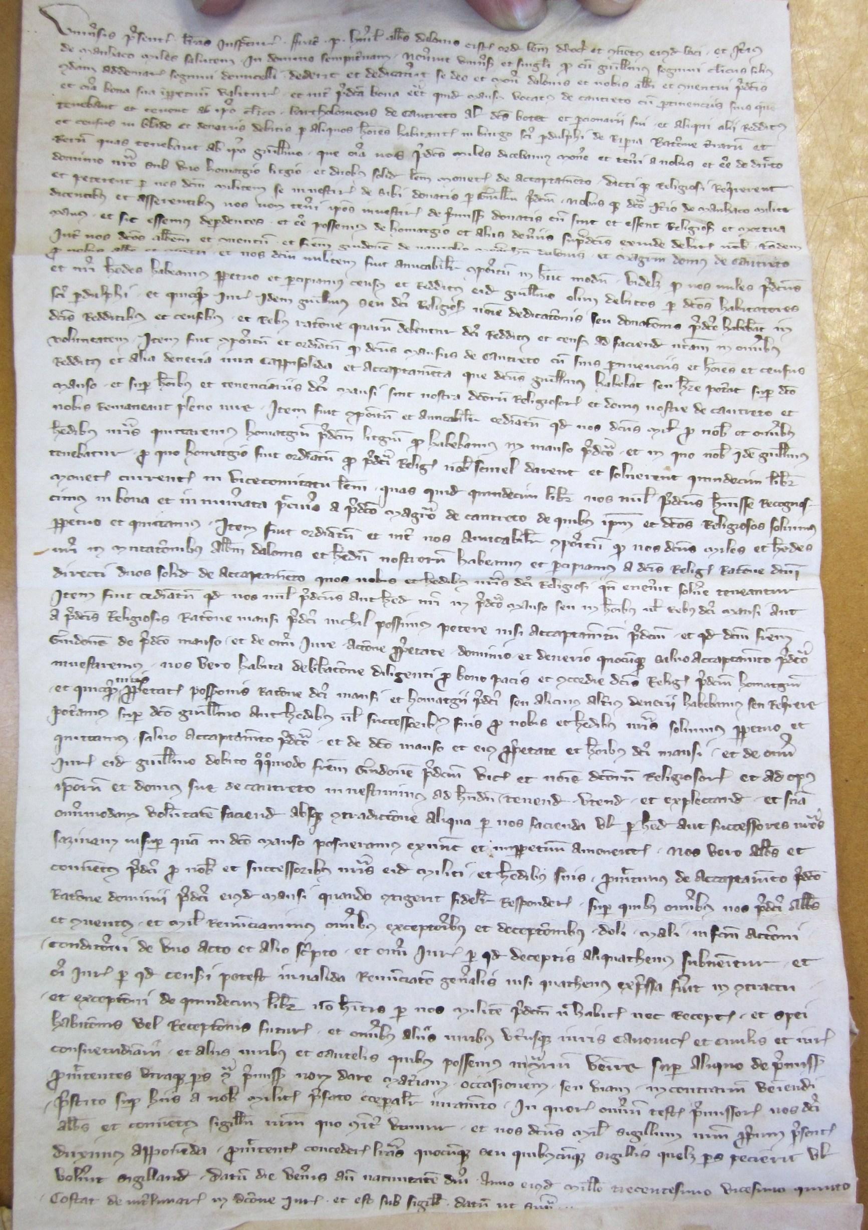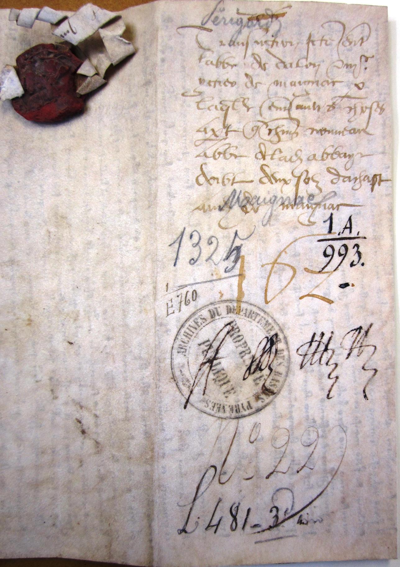 Transaction entre Itier de Magnac et l'abbaye de Dalon (diocèse de Limoges), au sujet de l’hommage et de 2 sous de Limoges dus par les religieux à Itier de Magnac à chaque changement d'abbé (1325)