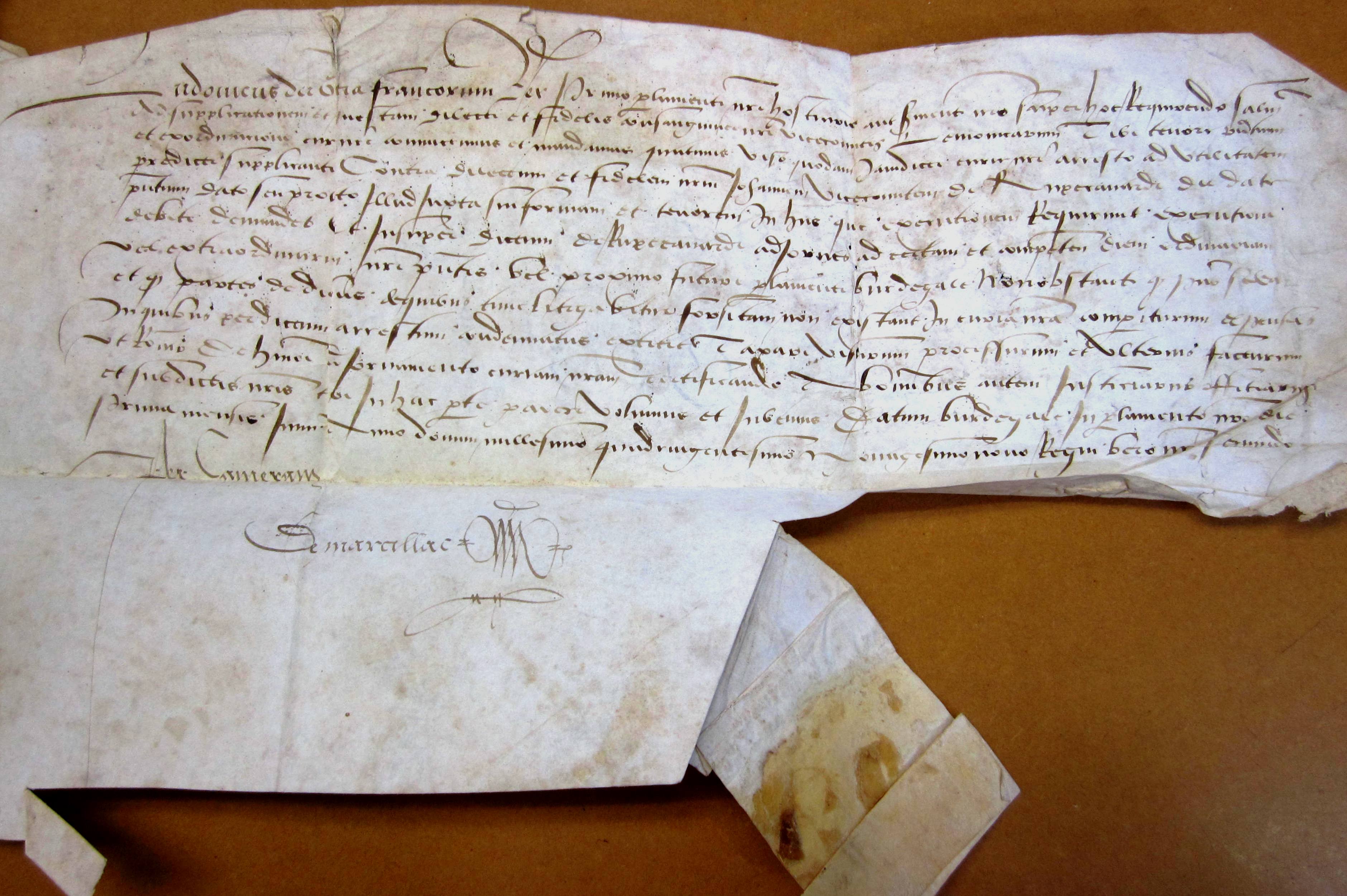 Exécutoire d'un arrêt du Parlement de Bordeaux, décerné à la requête du vicomte de Limoges,contre Jean, vicomte de Rochechouart touchant la paroisse de Maraval (1499).