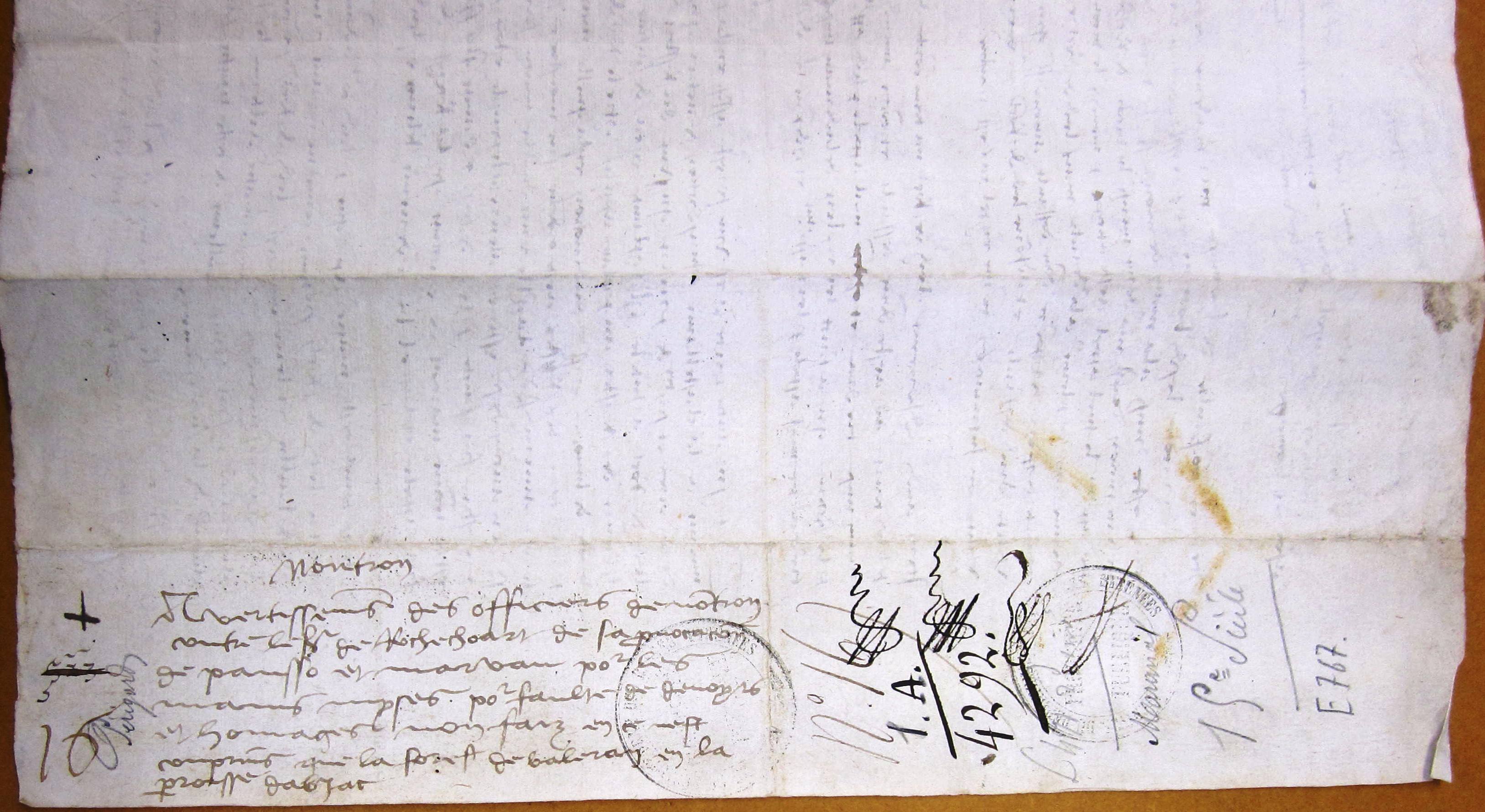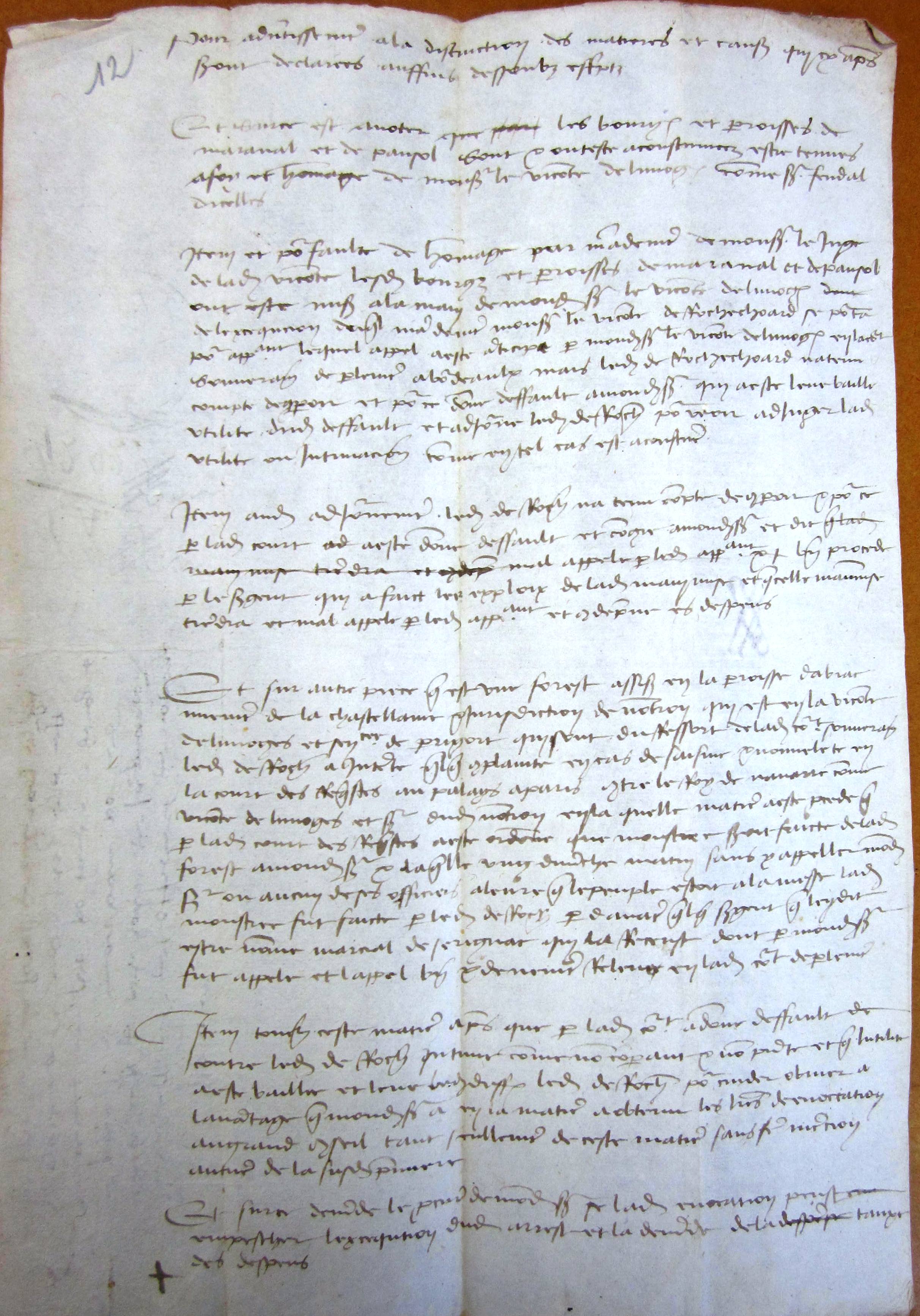 Instructions et avertissements des officiers de Nontron contre le seigneur de Rochechouart appellant au grand conseil de la main mise des bourg et parroisses de Maraval et de Pauzou pour cause d'hommage non fait (15ème siècle).