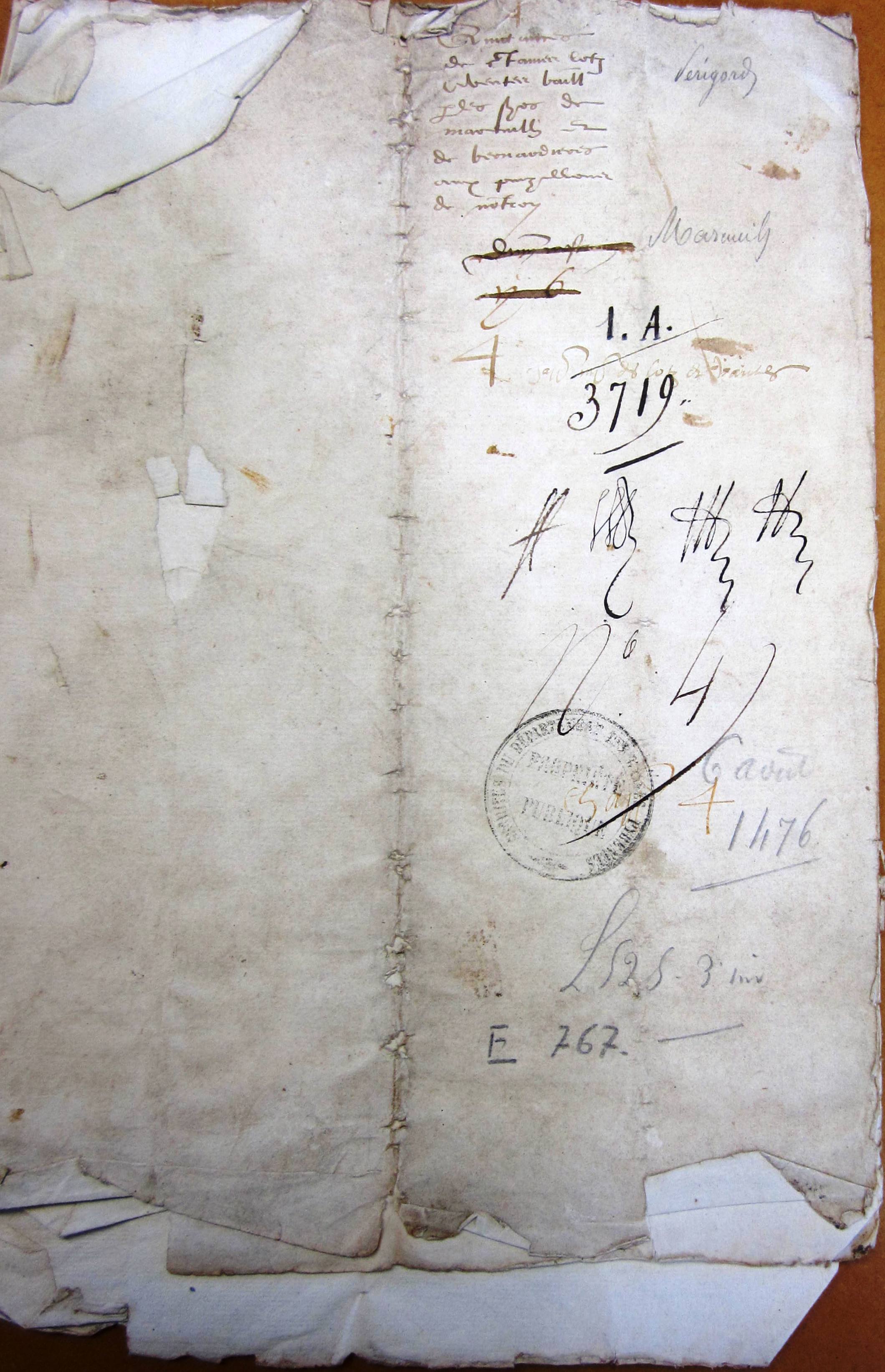- chapitre 4 (lods et ventes, etc. ), cotté n° 4 (Inventaire Jean Fabre - E 607), avec le résumé suivant : "Quittances de certains lods et ventes baillées par les seigneurs de Mareuil et de Bernardières aux Puzillons de Nontron "