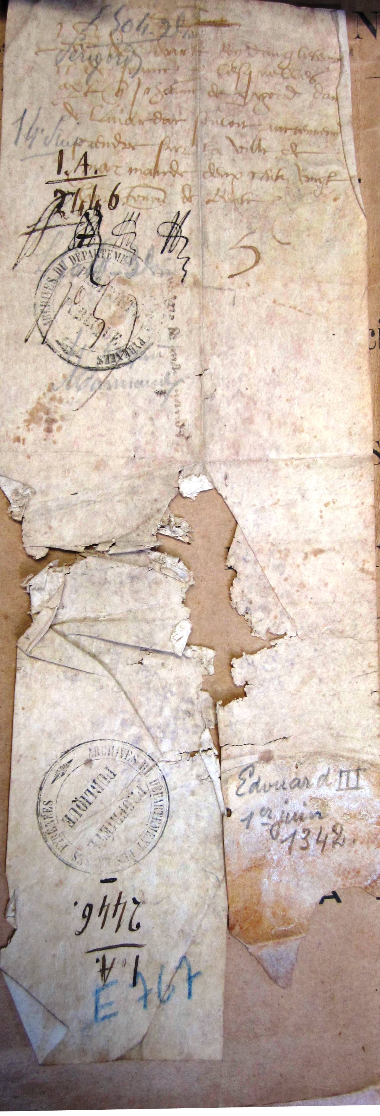 Lettres d'Edouard III d'Angleterre concernant la rente de 220 livres sur le péage de Marmande (1er juin 1342).