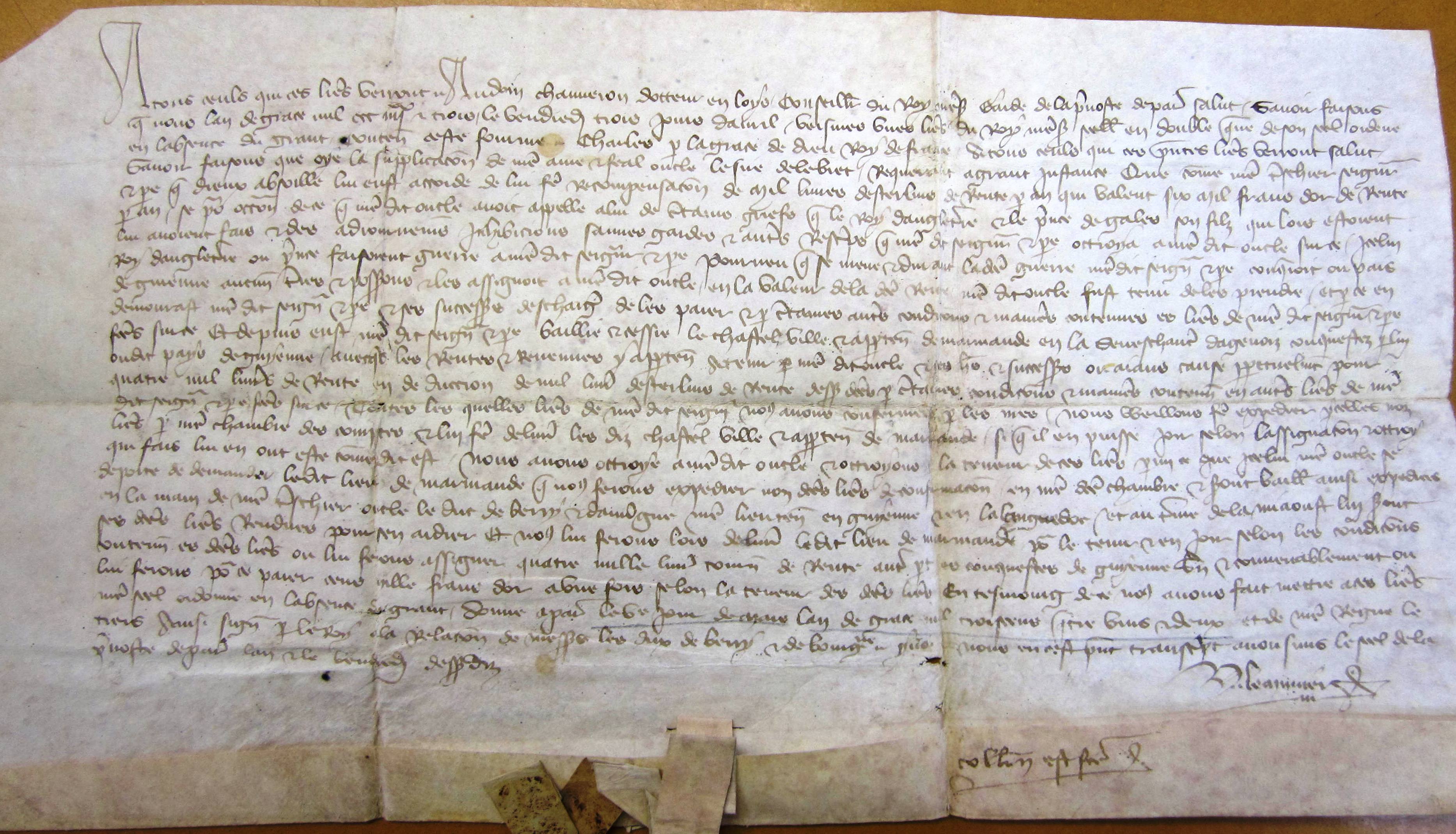 Assignation de 6.000 francs d'or de rente par Charles VI à Arnaud-Armanieu, sire d'Albret, sur la ville de Marmande (1382 v. st.).
