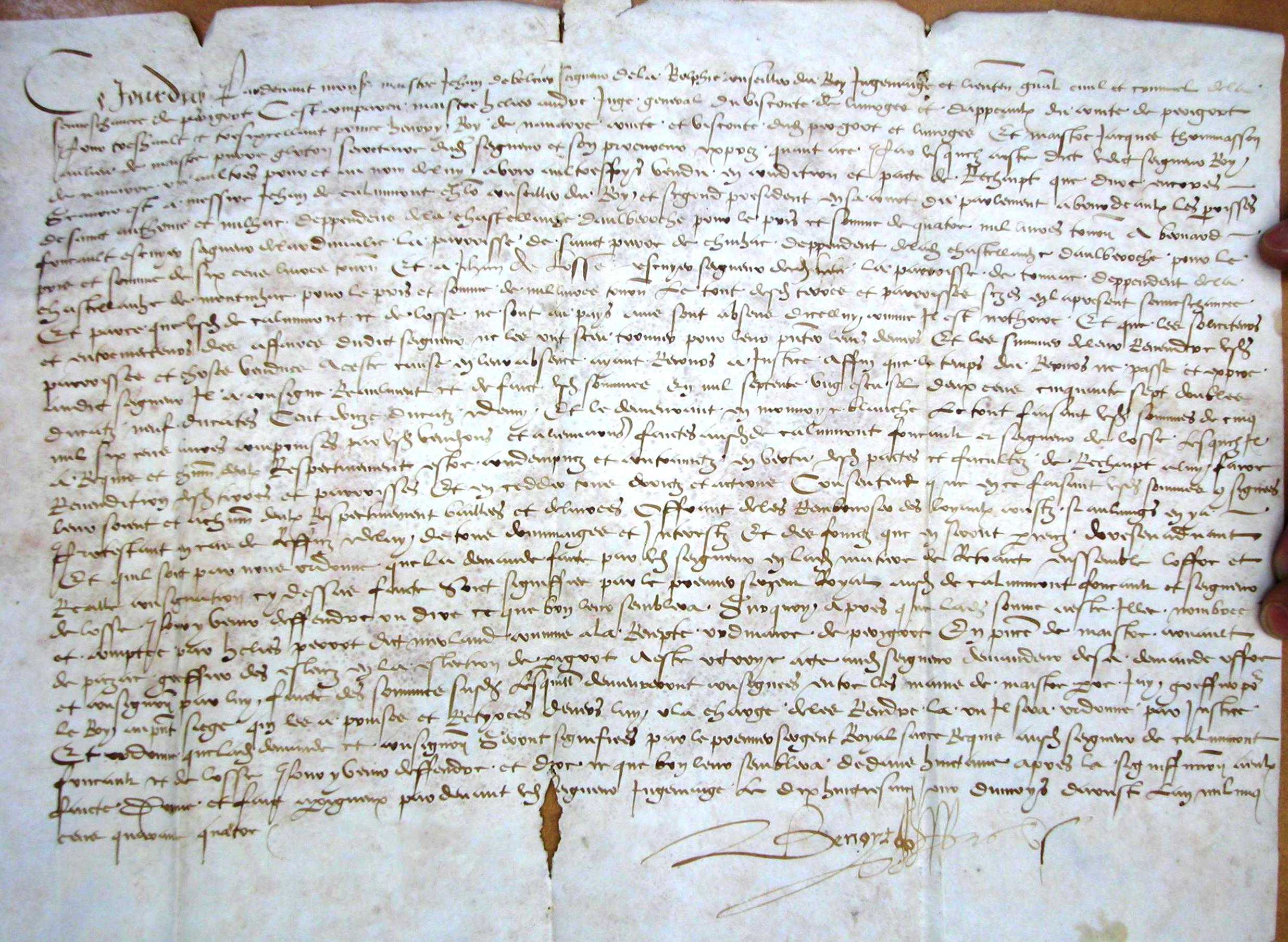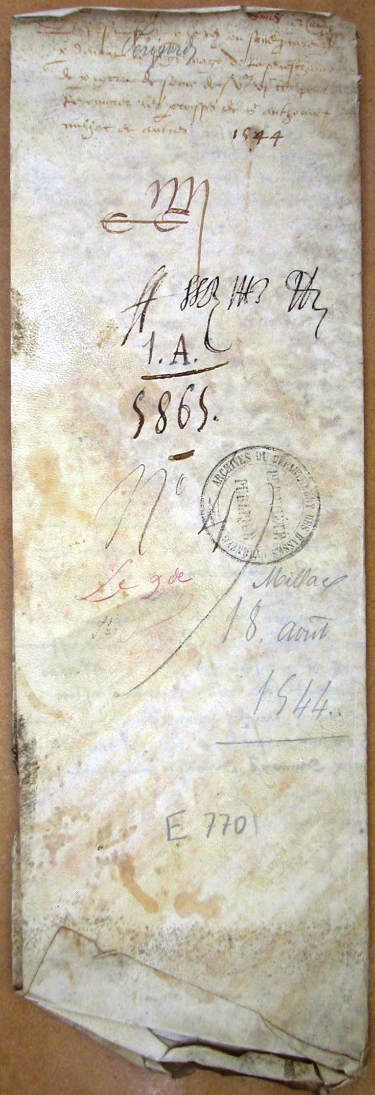 Dépôt de 5.600 livres fait par le roi de Navarre devant le juge mage de Périgord pour le rachat des paroisses de Milhac, Chignac et autres (1544).