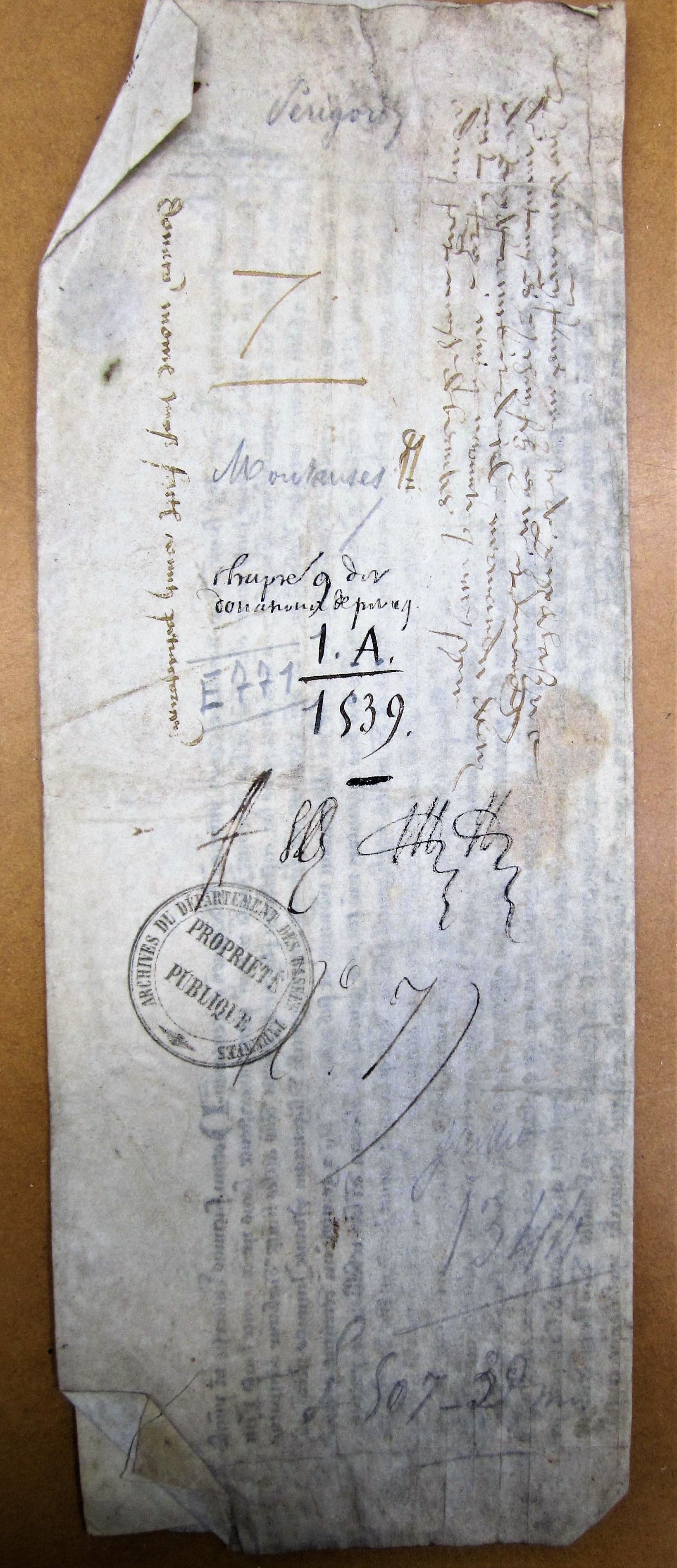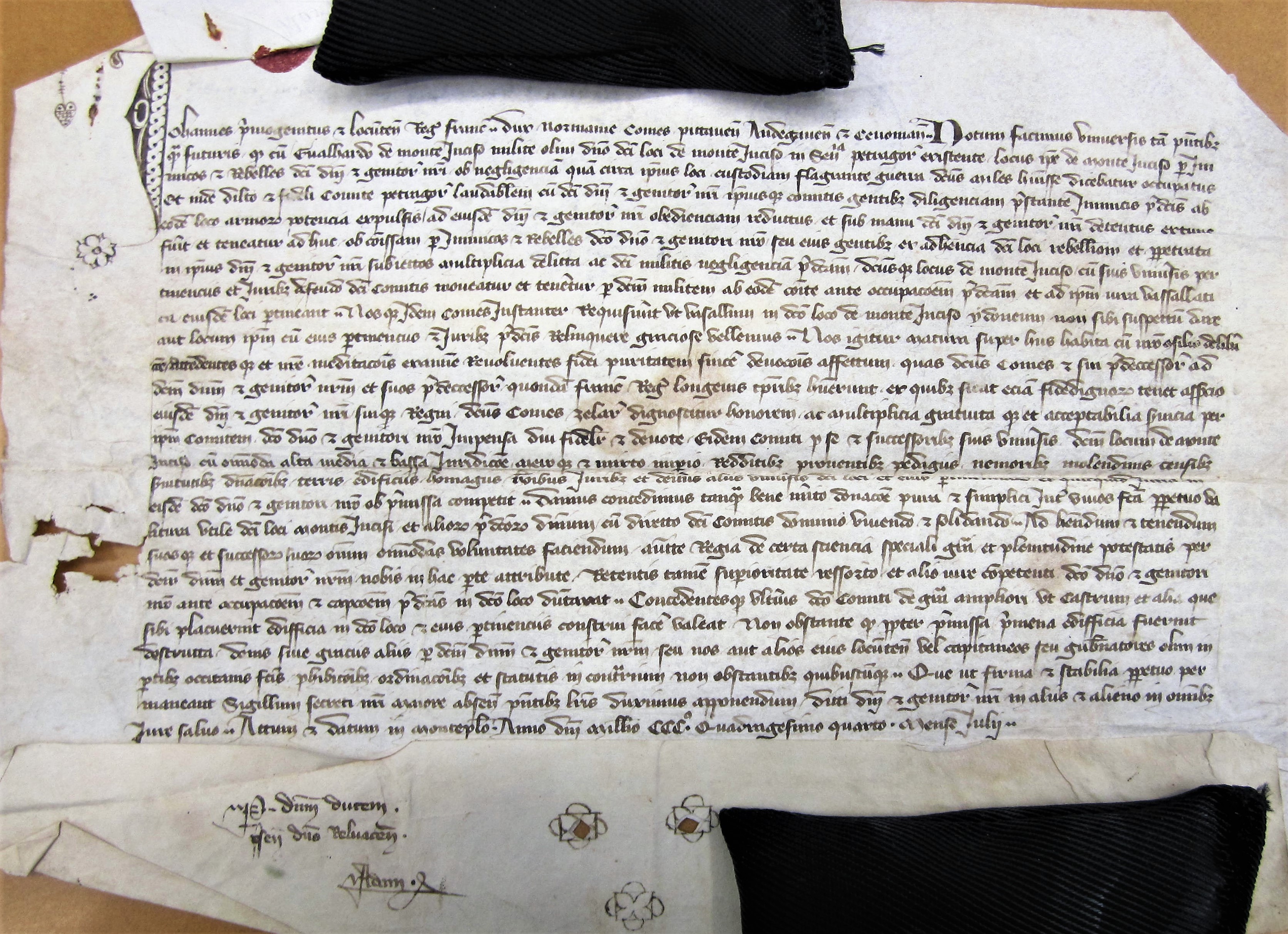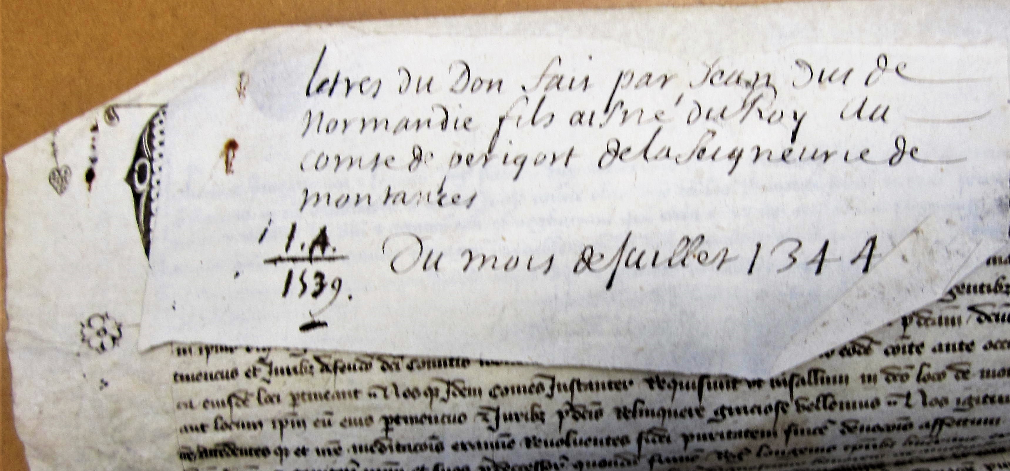 Johannes primogenitus et locum tenens regis Franciae, dux Normanniae, comes Pictav., Andegav. et Cenomaniae, notum facimus universis tam praesentibus quam futuris quod cum Galhardo de Monte Inciso milite olim domino dicti loci de Monte Inciso in senescallia petrag. existente, locus ipse de Monte Inciso, per inimicos et rebelles dicti domini et genitoris nostri ob negligentia quam cura ipsius loci custodiam flagrante guerre dictus miles habuisse dicebatur, occupatus et inde dilecto et fideli comite petrag. laudabilem et dicti domini et genitoris nostri ipsiusque comitis gentibus diligentiam praestante inimicis praedictis ab eodem loco armorum potentia expulsis ad ejusdem domini et genitoris nostri obedientiam reductus, et sub manu dicti domini et genitoris nostri detentus ex tunc fuerit, et teneatur adhuc ab commissam per inimicos et rebelles dicti domino et genitori nostro seu ejus gentibus et adherentia dicti loci rebellioni et perpetrata in ipsius domini et genitoris nostri subjectos multiplicia delicta ac dicti militis negligentiam praedictam, dictusque locus de Monte Inciso cum suis universis pertinenciis et juribus de feudo dicti comitis moveatur et teneatur per dictum militem ab eodem comite ante occupationem praedictam et ad ipsum jura vassalatica ejusdem loci pertineant, nosque idem comes instanter requisivit ut vassalum in dicto loco de Monte Inciso ydoneum non sibi suspectum dare aut locum ipsum et ejus pertinentiis et juribus praedictis relinquere gratiose vellemus, nos igitur matura super hiis habita cum nostro consilio deliberatione attendentesque et nostrae meditationis ex examine revolvente fidei paritatem, sincerum devotionis affectum quas dictus comes et sui praedecessores ad dictum dominum et genitorem nostrum et suos praedecessores quondam Franc. reges longevis temporibus habuerunt, et quibus sicut etiam fidedignorum tenet assertio ejusdem domini et genitoris nostri suique regni dictus comes zelare dignoscitur honorem ac multiplicit. gratuitaque et acceptabilia servitia per ipsum comitem dicto domino et genitori nostro impensa, diu, fideliter et devote, eidem comiti pro se et successoribus suis universis dictum locum de Monte Inciso cum omnimoda, alta, media et bassa jurisdictione, meroque et mixto, imperio, redditibus, proventibus, pedagiis, nemoribus, molendinis, censibus, servitutibus, dominationibus, terris, aedificiis, homagiis, hominibus, juribus et deveriis aliis universis dicti loci et ejus pertinentiarum et quidquid juris in eisdem dicto domino et genitori nostro ob praemissa competit, damus, concedimus tamquam benemerito donatione pura et simplici inter vivos facta perpetuo valitura utile dicti loci Montis Incisi et aliorum praedictorum deveriorum cum directe dicti domini comitis dominio uniendo et soldando ad habendum et tenendum suosque et successorum suorum omnium omnimodas voluntates faciendum auctoritate regia, de certa scientia etc. … retentis tamen superioritate, ressorto et alio jure competenti dicto domino et genitori nostro ante occupationem et captionem praedictas in dicto loco dumtaxat concedente sibi placuerit aedificia in dicto loco et ejus pertinentiis construeri facere valeat, nonobstante quod praemissa primeva aedificia fuerint destructa …. Quae ut firma et stabilia … sigillum secreti nostri majore absente praesentibus litteris duximus apponendum … Actum et datum in Monteplo, anno Domini M° CCC° quadragesimo quarto, mense julii. Et sur le repli, per dominum ducem praesente domino Bellav., et pendoit le sceau dont on voit le trou du cordon, perdu. Ex autograph., in pergam.