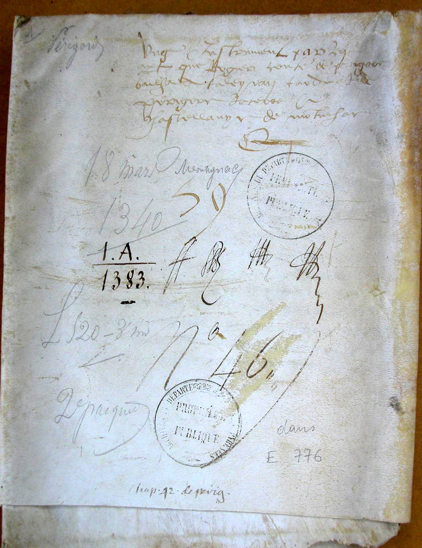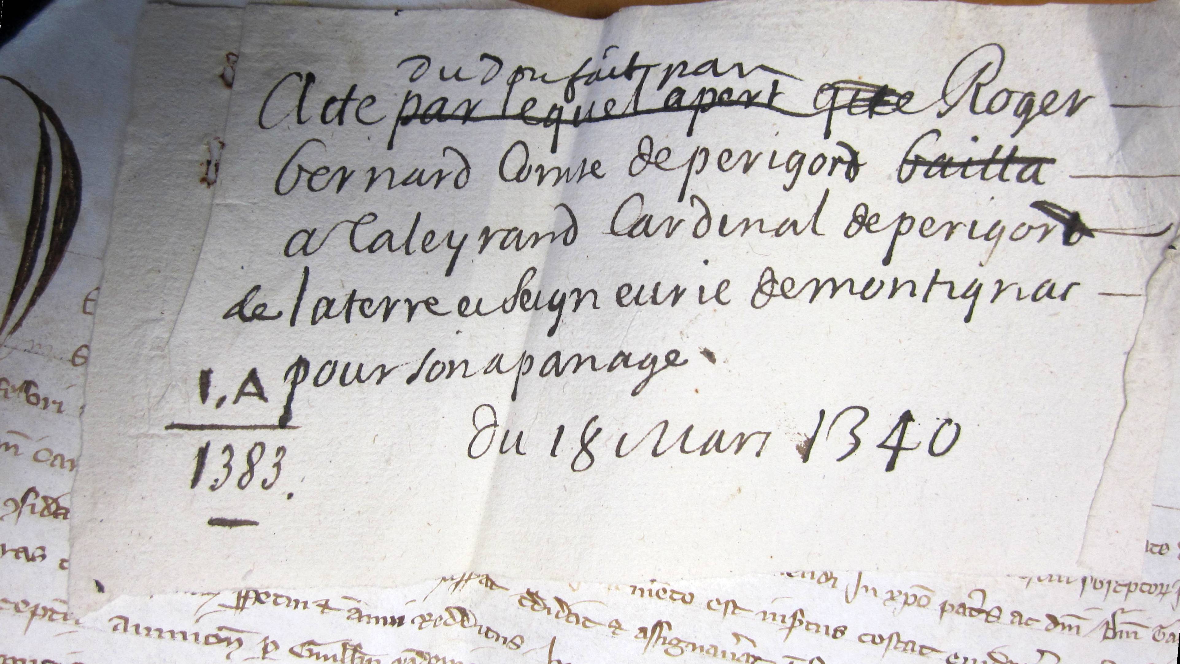 Lettres par lesquelles Roger-Bernard, comte de Périgord, donne au cardinal de Taleyrand son frère, la terre de Montignac, pour son appanage (1340 v. st.).
