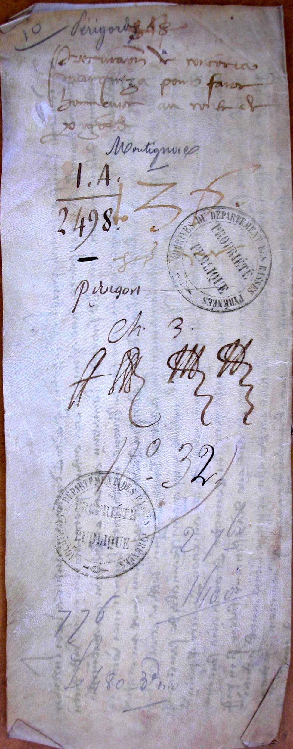 cotté n° 136 dans le chapitre n° 3(hommages et dénombrements) dans l'inventaire Périgord de Jean Faure (voir registre E 607 sur ce site, f° 58 v°)
