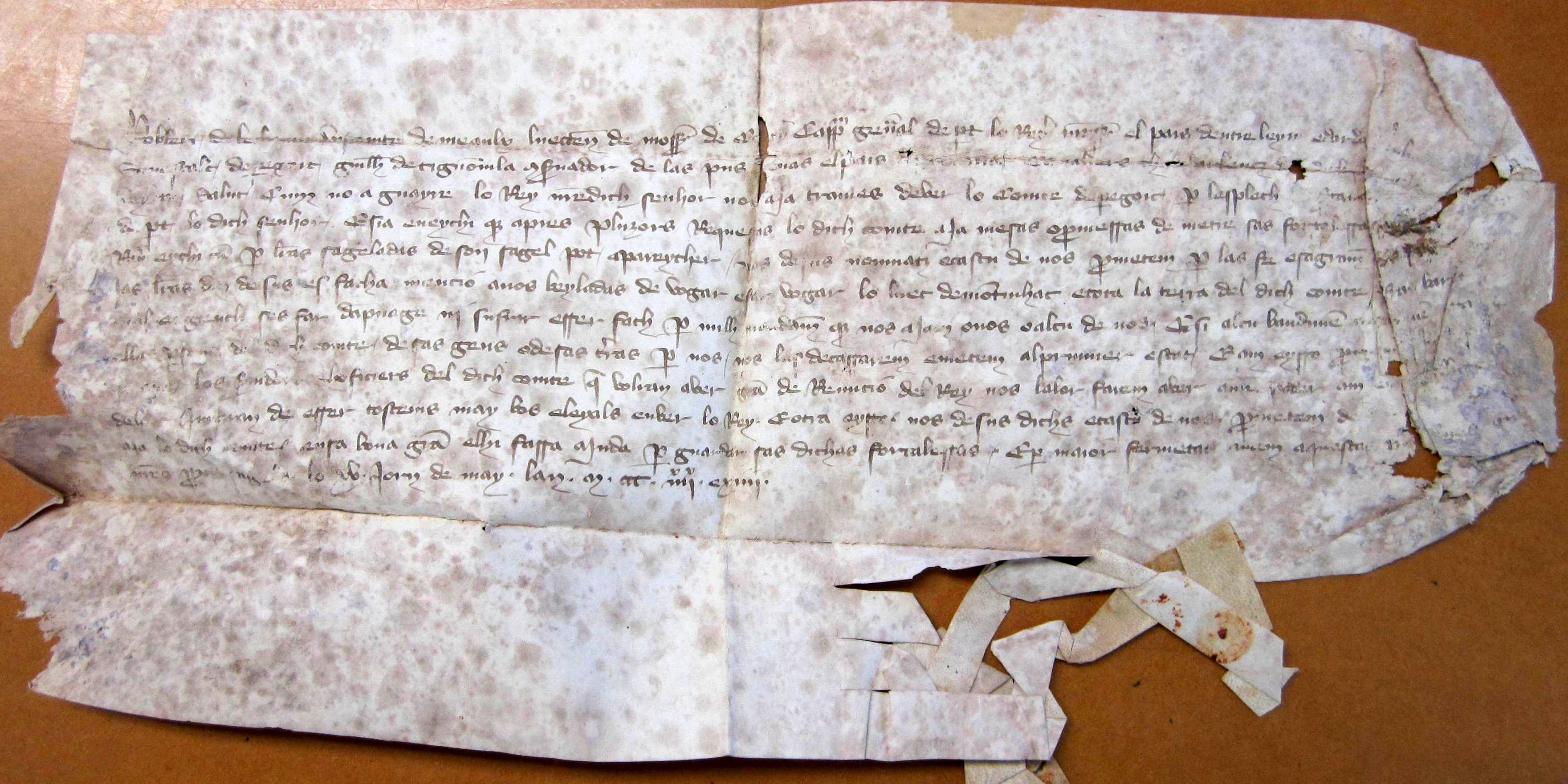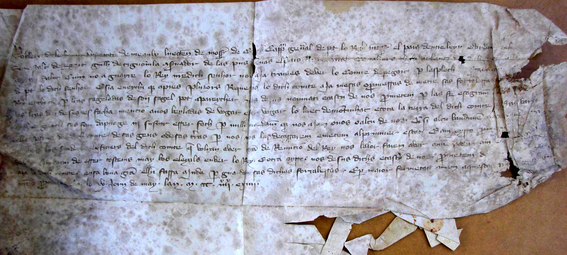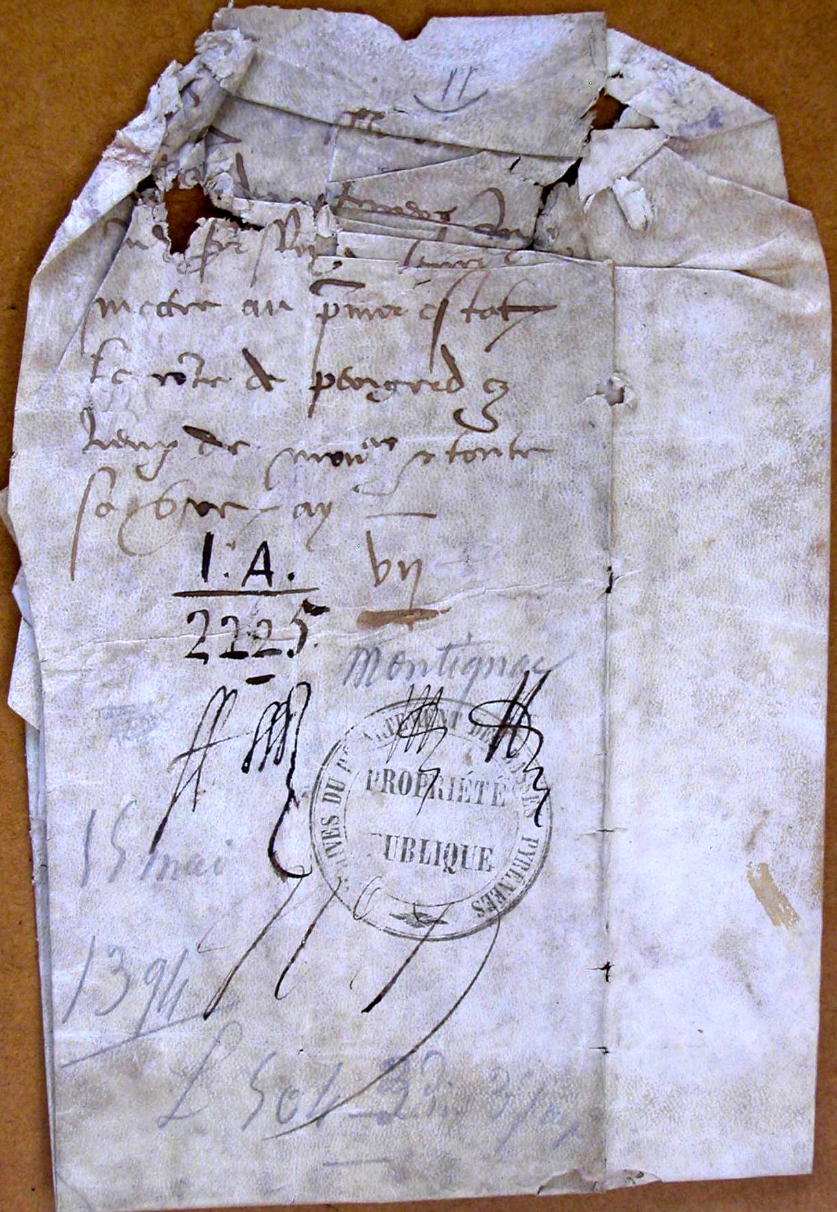 senescalc de Peregòrt (2), Guilhem de Tignonvila (3) conservador de las presens [tre]vas el país (… pliure et fin de ligne effacée…) salut. Cum no a guayre lo Rey Nòstre dich Senhor nos aja tramés dever lo Comte de Peregòrt per l’esplech [de] serta (… pliure et fin de ligne effacée et déchirée) de part lo dich senhor e sia eneychí que après pluzors requestas lo dich comte aja mesas o promessas de metre sas fortalessas ( fin de ligne pliée et déchirée) Rey aychí cum per letras sageladas de son sagel pòt apareycher, nos dejús nomnatz e cascú de nos prometem per las fe e sagramen ( fin de ligne pliée et effacée) las letras d’en desús es facha mencio a nos bayladas de vogar (4) e far vogar lo luòc de Montinhac e tota la terra del dich comte ( fin de ligne pliée et déchirée et début de ligne suivante taché et effacé ) ses far dampnatge ni sufrir èsser fach per nulh [man]damen que nos ajam o nos o alcú de nos ; e si alcu bandimen ( fin de ligne pliée et effacée et début de ligne suivante taché et effacé) del dich comte, de sas gens o de sas terras per nos, nos las decassarem e metrem al primier estat ; e am ayssò pro[metem] ( fin de ligne pliée et effacée et début de ligne suivante taché et effacé) los … oficiers del dich comte que volran aver gràcia de remicio del Rey nos la lor farem aver a nòstre poder am ( fin de ligne pliée et effacée) val (.. effacé..)an de èsser tostems may bos e leyals enver lo Rey ; e otra [ayssò] nos desús dich e cascú de nos prometem de ( fin de ligne pliée et effacéeée) aja lo dich comte en sa bona gràcia e lhi fassa ajuda per gardar sas dichas fortalessas. E per maior fermetat avem aquestas presens [letras] ( fin de ligne pliée et effacée) nòstre pròpri sagel,. Lo XV jorn de may l’an M CCC IIII XX e XIIII.