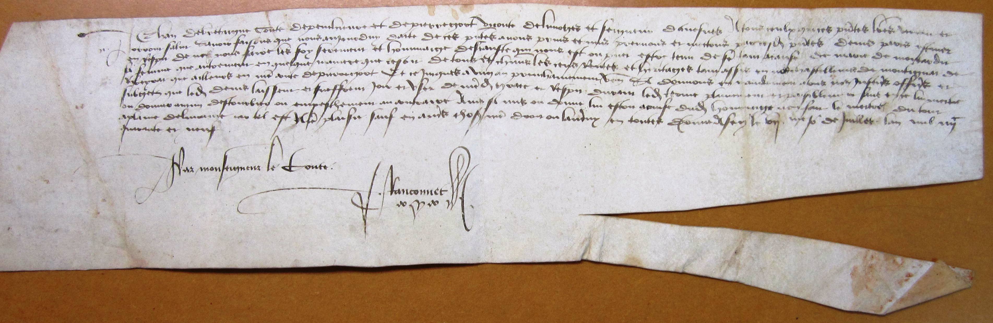 Délai d'un an accordé par Jean de Bretagne, comte de Périgord, à Denis Paris, écuyer, pour rendre l'hommage de ce qu'il tenait dans la châtellenie de Montignac et de Ribérac (1449).