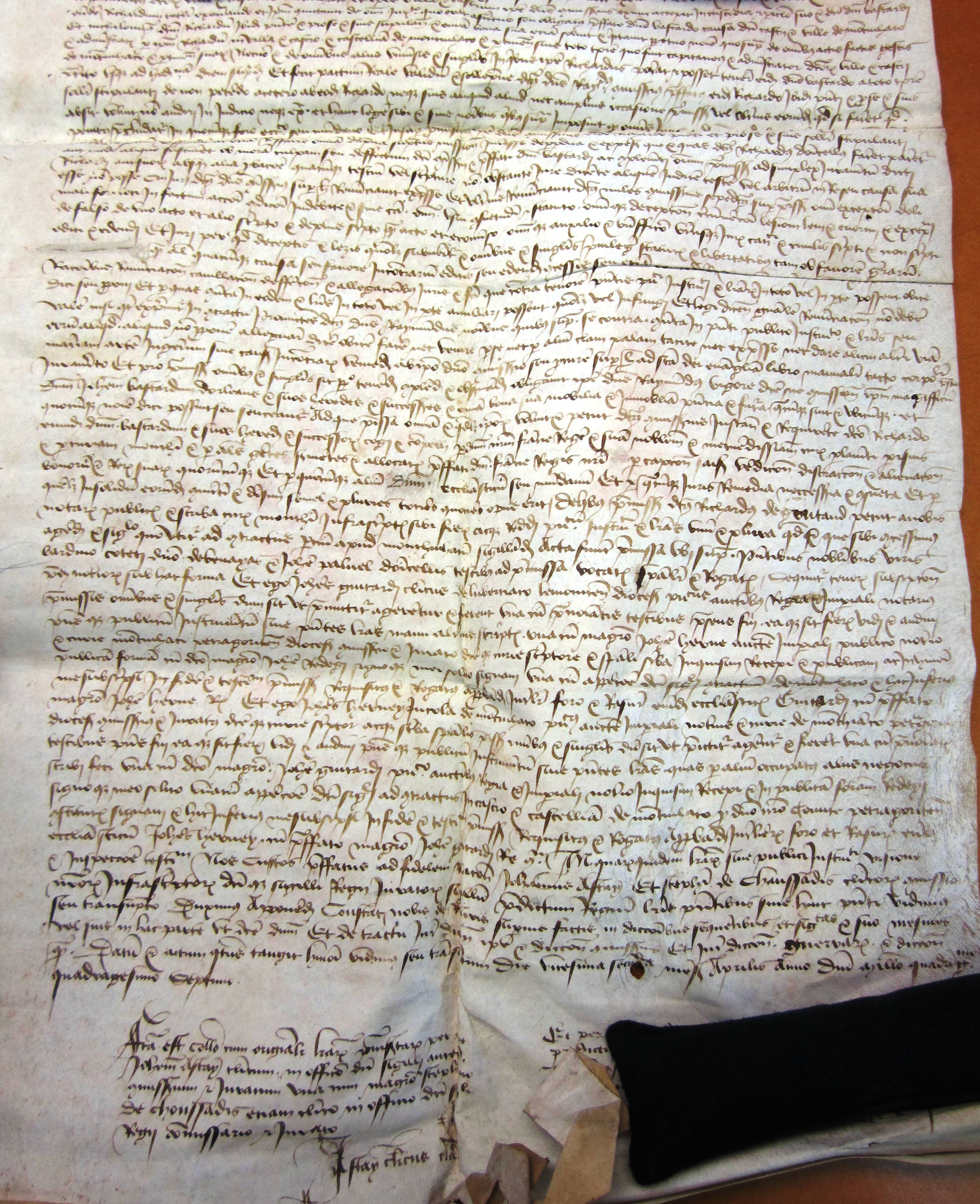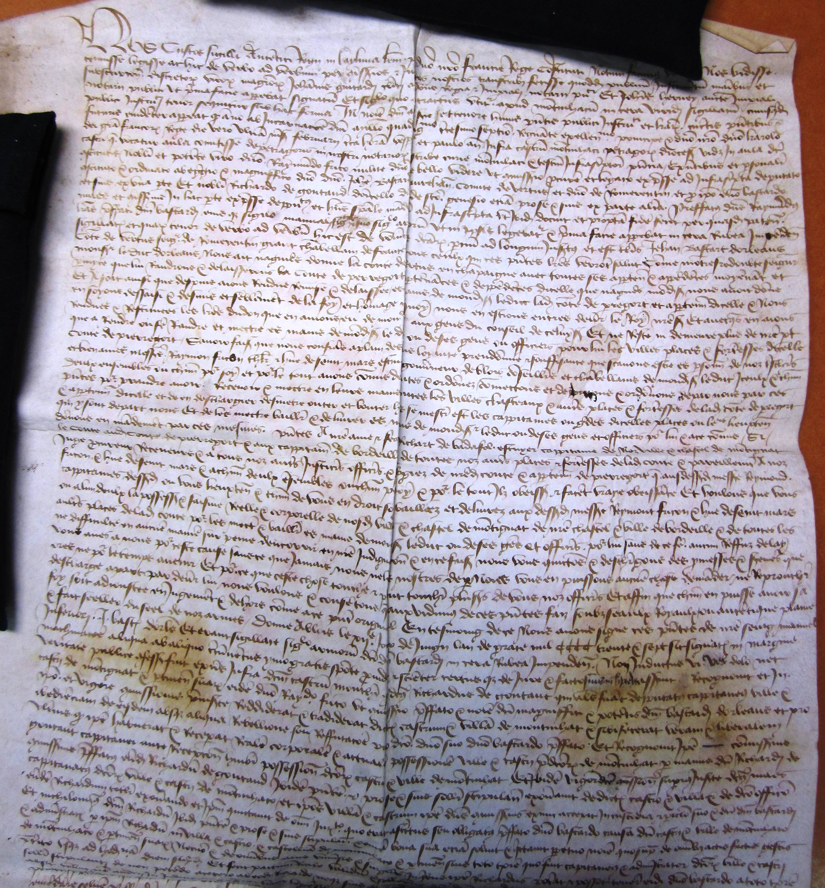 In nomine Domini, Amen. Scit et tenore hujus presentis publici instrumenti et harum cunctis presentibus et futuris evidenter appareat quod anno ab incarnatione Domini millesimo quadringentesimo trecesimo septimo, regnante exellentisimo principe et domino nostro domino Karolo, Dei gracia Francorum rege, die vero ultima mensis februarii, circa horam vesperam et paulo ante, infra castrum Montinhaci, Petragoricensis diocesis, videlicet in aula dicti castri qua vocatur aula comitisse de Petragoris, in nostra notariorum et scribe curie Montinhaci et testium infrascriptorum presencia, Existentibus et personaliter constitutus nobili et potente viro domino Raymundo Frico, milite, domino de Bellovidere, ut commissario, procuratore et legato expresse ad infrascripta deputato constituto et ordinato ab egregio et magnifico domino domino Johanne bastardo Aurelianis, comite de Vertus et domino de Romerentin, et pro ipso bastardo et suis, ex una parte. Et nobili Richardo de Gontaud, domicello, domino de Sancto Genesio, etiam pro se et suis ex parte altera. Preffatus dominus Raymundus miles et commissionis in hac parte expresse depputatus, et hujus speciale mandatum ad infrascipta, ut ibidem docuit et promptam fidem fecit per quasdam patentes litteras preffati domini bastardi, eius que signo manuali signatas, et suo sigillo [...] ut in ipsis legebat et prima facie apperebat in cera rubeta impendendem sigillatas, et quarum tenor de verbo ad verbum hic est, de voluntate dictarum partum, ad longum insertus et est talis :
