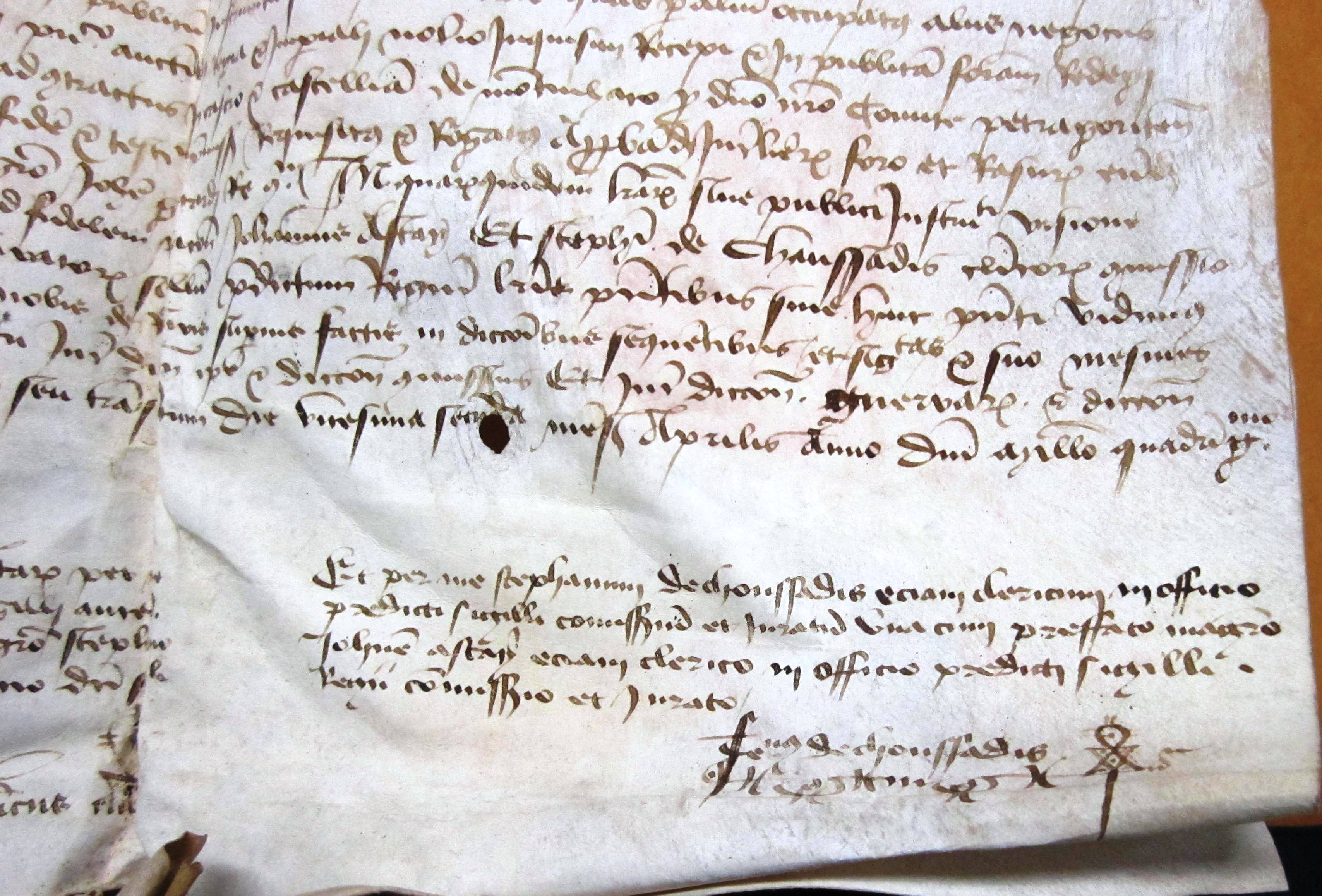 Et ego Johannes Hervey, incola de Montinhaco, publicus auctoritate imperiali notarius et curie de Montinhaco Petragoricensis diocesis commissarius et juratus, dicteque curie scriptor acque scriba specialis [...] omnibus et singulis dimisit ut premittitur agerentur et fierent unacum prenominatis testibus presens fui ea que sit fieri, vidi et audivi presensque publicum instrumentum sive presentes litteras quas per alium occupatus aliis negociis scribi feci, unacum dicto magistro Johanne Guitardi, publico auctoritatibus regia et imperiali notario inquistii, recepi et in publicam formam redegi, signo que meo solito, unacum appencione dcti sigilli ad contractus in castro en castellania de Montinhaco per domino nostro comite Petragoricensis constitutis, signam et hic inferius me subscripsi in fidem et testimonium premissorum requisitis et rogatus. Approbat de interlinearum foro et rasuris eiddem ecclesiasticum Johannes Hervey cum preffato magistro Johanne Guitardi re [...] : In quarumquidem litterarum sive publici instrumenti, visione et inspectare, testium. Nos custos preffatus ad fidelem rationem Johannis Astay et Stephano de Chaussadis, clericorum commissio nostrorum infrascriptorum, dictique sigilli regii juratorum, sigillum predictum regium litteris presentibus sive huic presenti vidimus seu transumpto duximus apponendum. Constat nobis de rasuris superius factis in [...] sequentibus : et signatas, et suo, mesmes, etc. Datum et actum quatenus tangit hujusmodi vidimus seu transumptum, die vicesima secunda mensis aprilis anno Domini millesimo quadringentesimo quadragesimo septimo.