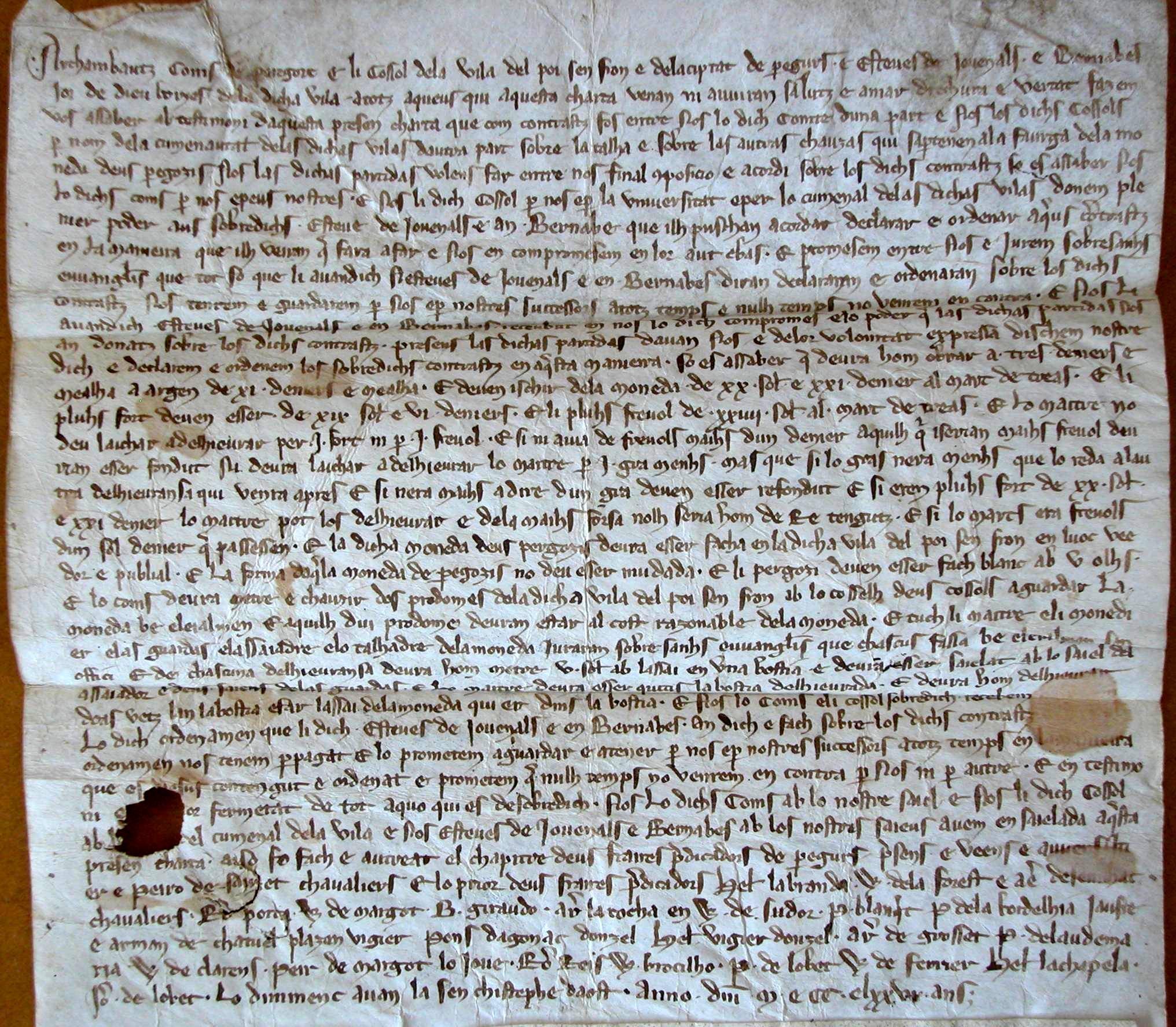 Contrat entre Archambaud III, comte de Périgord, et les consuls de Périgueux pour la frappe de la monnaie de Périgueux (1276) - Texte en occitan médiéval.
