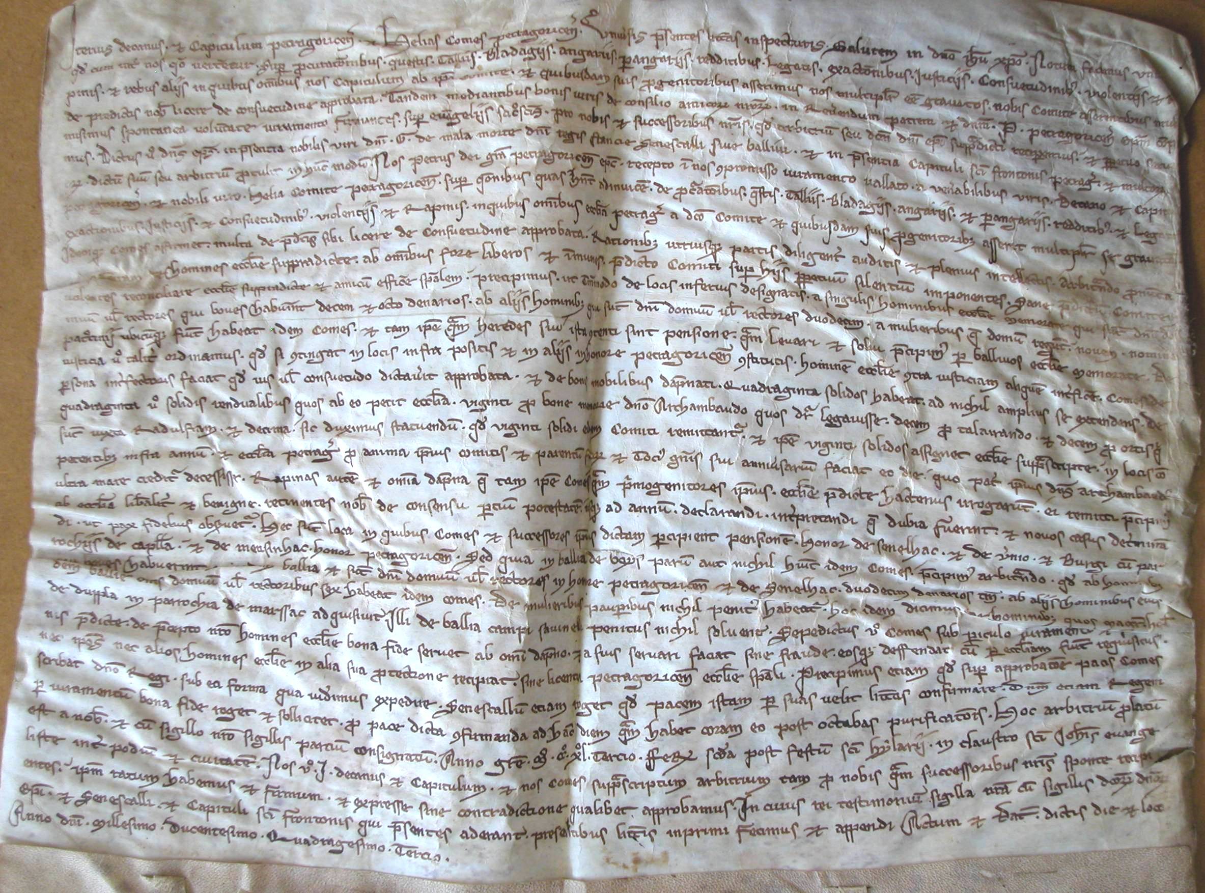 Accord entre l'évêque et le chapitre de Périgueux d'une part, et le comte de Périgord d'autre part, accordant aux premiers divers droits seigneuriaux sur les habitants de Saint-Front de Périgueux ainsi que dans d'autres parties du Périgord (1243)
