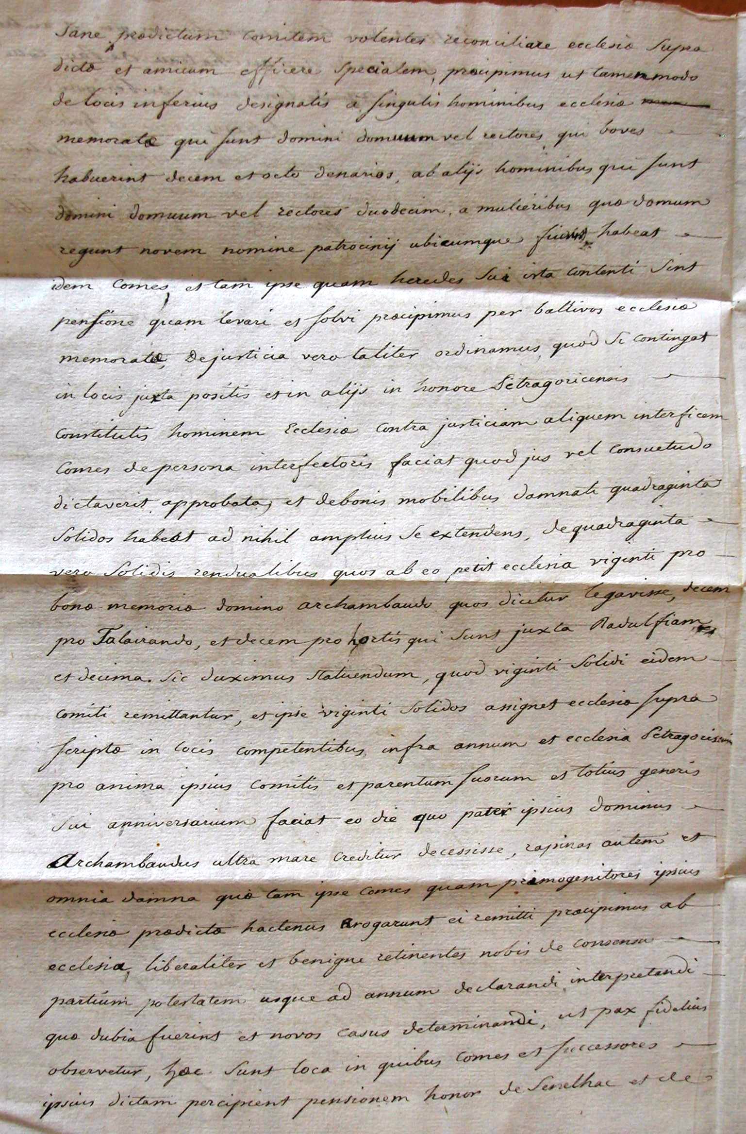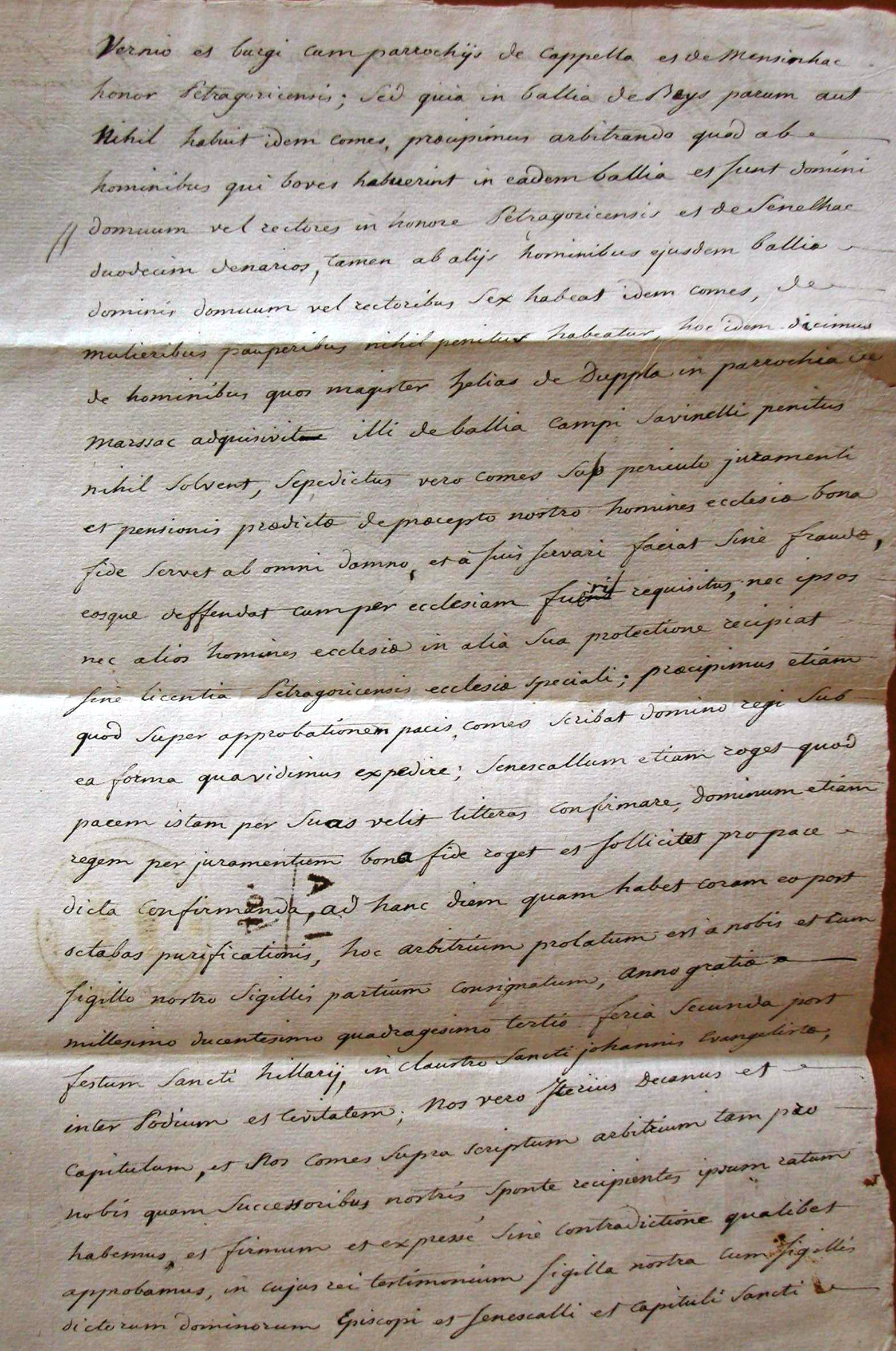 Nos Petrus, Dei gratia Petragoricensis episcopus recepto in nos compromisso juramento vallato a venerabilibus viris decano et capitulo Petragoricense et nobili viro Helia comite Petragoricense super questionibus quas habent ad invicem de procurationibus, questis, talhiis, bladagiis, angariis et perangariis, redditibus et legatis exactionibus, justiciis et consuetudinibus violentiis et rapinis in quibus omnibus ecclesia Petragoricens. a dicto comite et quibusdam suis progenitoribus asserit multipliciter se gravatam, idemque comes affirmet multa de predictis sibi licere de consuetudine approbata, rationibus utriusque partis diligenter auditis et plenius intellectis, arbitrando pronunciamus terram et homines ecclesie supradicte ab omnibus fore liberos et immunes predicto comiti super his perpetuum silentium imponentes. Sane predictum comitem volentes reconciliare ecclesie supradicte et amicum efficere specialem precipimus ut tamenmodo de locis inferius designatis a singulis hominibus ecclesie memorate qui sunt domini domuum vel rectores qui boves habuerint decem et octo denarios, ab aliis hominibus qui sunt domini domuum vel rectores duodecim a mulieribus que domum regunt novem nomine patrocinii, ubicumque fuerit, habeat idem comes et tam ipse quam heredes sui ista contenti sint pensione quam levari et solvi precipimus per ballivos ecclesie memorate de justicia vero taliter ordinamus quod si contingat in locis infra positis et in aliis in honore Petragoricense constitutis hominem ecclesie contra justiciam aliquem interficere comes de persona interfectoris faciat quod jus vel consuetudo dictaverit approbata, et de bonis mobilibus damnati quadraginta solidos habeat ad nihil amplius se extendens, de quadraginta vero solidis rendualibus quos ab eo petit ecclesia viginti pro bone memorie domino Archambaudo quos dicitur legavisse, decem pro Talairando, et decem pro hortis qui sunt juxta Radulfiam et decima sic duximus statuendum, quod viginti solidi eidem comiti remittantur, et ipse viginti solidos assignet ecclesie suprascripte in locis competentibus infra annum et ecclesia Petragoricens. pro anima ipsius comitis et parentum suorum et totius generis sui anniversarium faciat eo die quo pater ipsius dominus Archambaudus ultra mare creditur decessisse, rapinas autem et omnia damna que tam ipse comes quam primogenitores ipsius ecclesie predicte hactenus arrogarunt ei remitti precipimus ab ecclesia liberaliter et benigne retinentes nobis de consensu partium potestatem usque ad annum declarandi, interpretandi que dubia fuerint et novos casus determinandi, ut pax fidelius observetur, hec sunt loca in quibus comes et successores ipsius dictam percipient pensionem honor de Senelhac et de Vernio et burgi cum parrochiis de Cappella et de Mensinhac honor Petragoricensis, sed quia in ballia de Boys parum aut nihil habuit idem comes, precipimus arbitrando quod ab hominibus qui boves habuerint in eadem ballia et sunt domini domuum vel rectores in honore Petragoricense et de Senelhac duodecim denarios, tamen ab aliis hominibus ejusdem ballie dominis domuum vel rectoribus sex habeat idem comes, de mulieribus pauperibus nichil penitus habeatur, hoc idem dicimus de hominibus quos magister Helias de Duppla in parrochia de Marssac acquisivit illi de ballia Campi Savinel penitus nichil solvent, sepedictus vero comes sub periculo juramenti et pensionis predicte de precepto nostro homines ecclesie bona fide servet ab omni damno et a suis servari faciat sine fraude, eosque deffendat cumper ecclesiam fuerit requisitus, nec ipsos nec alios homines ecclesie in alia sua protectione recipiat sine licencia Petrag. ecclesie speciali ; precipimus etiam quod super approbatione pacis comes scribat domino Regi sub ea forma qua vidimus expedire, senescallum etiam roget quod pacem istam per suas velit litteras confirmare ; dominum etiam regem per juramentum bona fide roget et sollicitet pro pace dicta confirmanda, ad hanc diem quam habet coram eo post octavas Purificationis, hoc arbitrium prolatum est a nobis et cum sigillo nostro, sigillis partium consignatum ; anno gratie millesimo ducentesimo quadragesimo tertio feria secunda post festum Sancti Hilarii, in claustro Sancti Johannis Evangeliste inter Podium et civitatem.