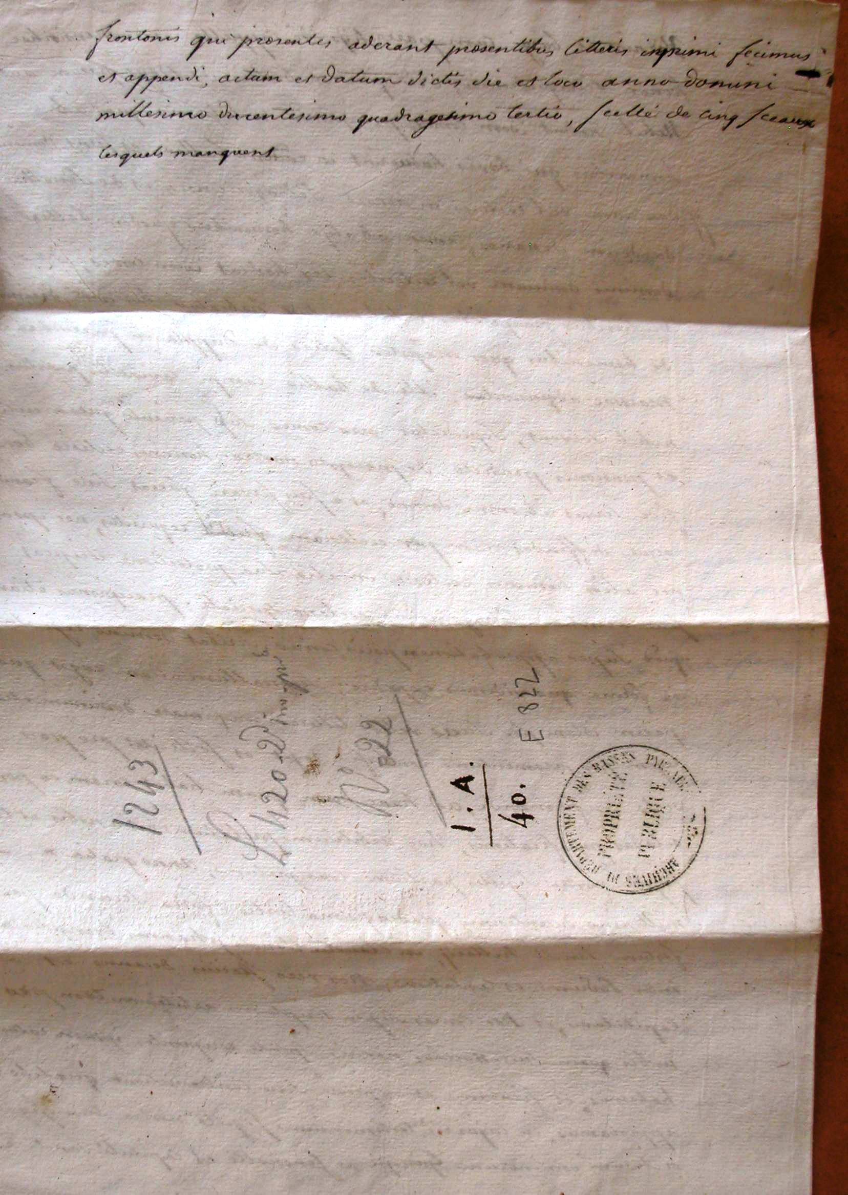 Nos vero Iterius decanus et capitulum, et nos comes suprascriptum arbitrium tam pro nobis quam successoribus nostris sponte recipientes ipsum ratum habemus et firmum et expresse sine contradictione qualibet approbamus, in cuis rei testimonium sigilla nostra cum sigillis dictorum dominorum episcopi et senescalli et capituli Sancti Frontonis qui presentes aderant presentibus litteris inprimi fecimus et appendi, actum et datum dictis die et loco anno Domini millesimo ducentesimo quadragesimo tertio.