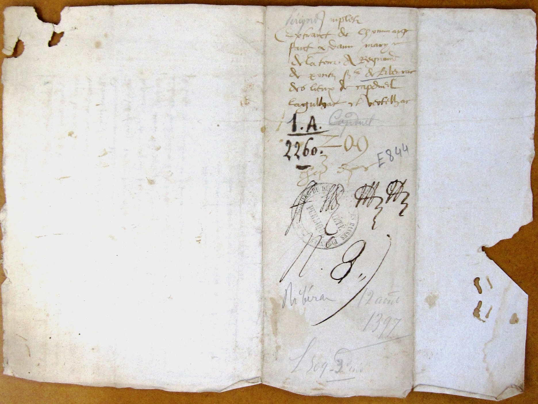 Actum apud Ribeyracum in ecclesia dicti loci duodecima die mensis augusti anno Domini millesimo trecentesimo nonagesimo septimo et presentibus nobilibus dominis Bertrando de Monte Leonis, Johanne Gombaudi militibus, Jacobo de Villa dicto (?) Castillano et pluribus aliis etc.
