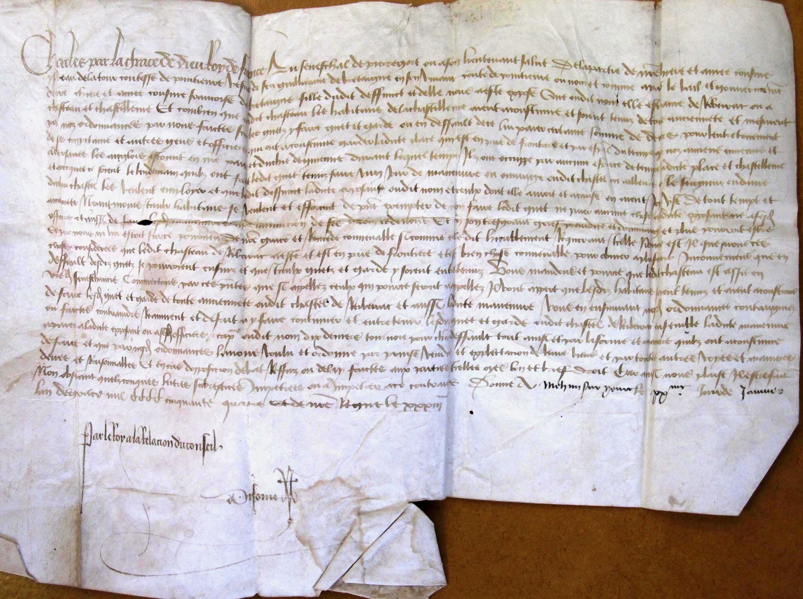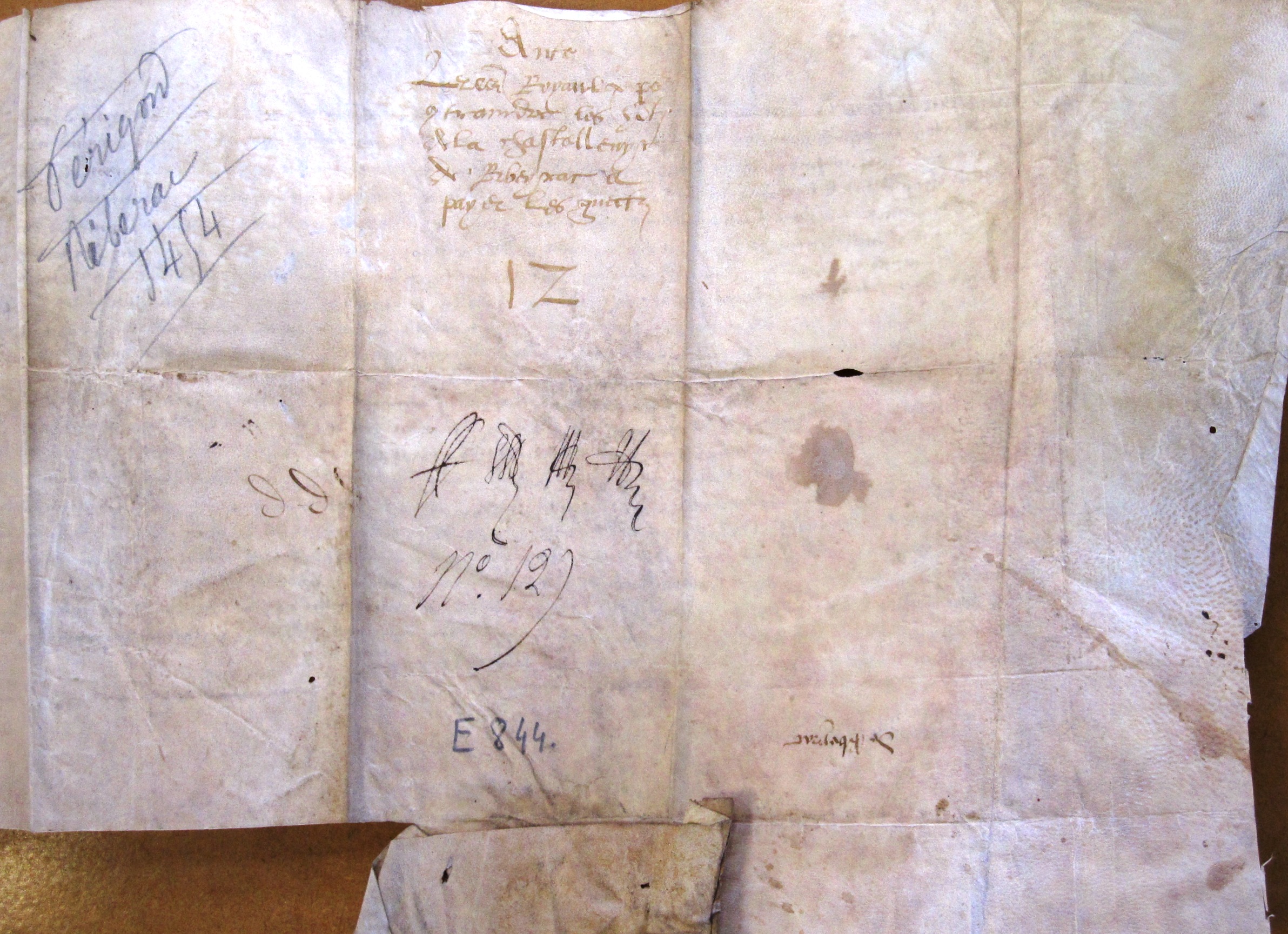 Lettres royaux impétrées par Isabeau de La Tour, mère de Françoise de Bretagne, pour contraindre les habitants de la châtellenie de Ribérac à faire le guet et garde au château de Ribérac, ou payer certaine somme d’argent. Ribérac (1454 (v. st.).