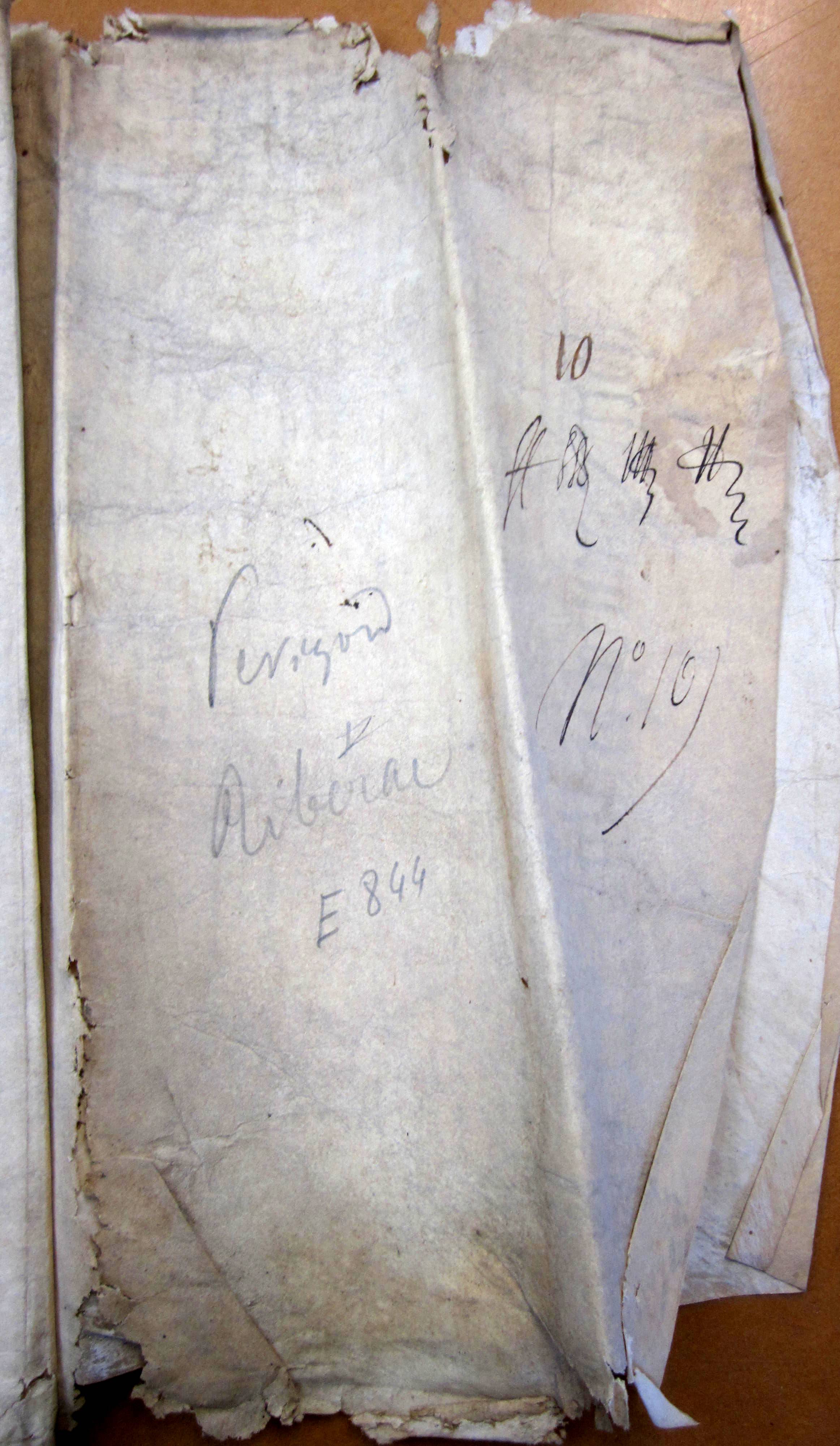 La pliure centrale du mss. est soit trouée, soit illisible, en raison de l’effacement de l’écriture. Nous ne répéterons pas cette indication, qui concerne pratiquement toutes les lignes du document.