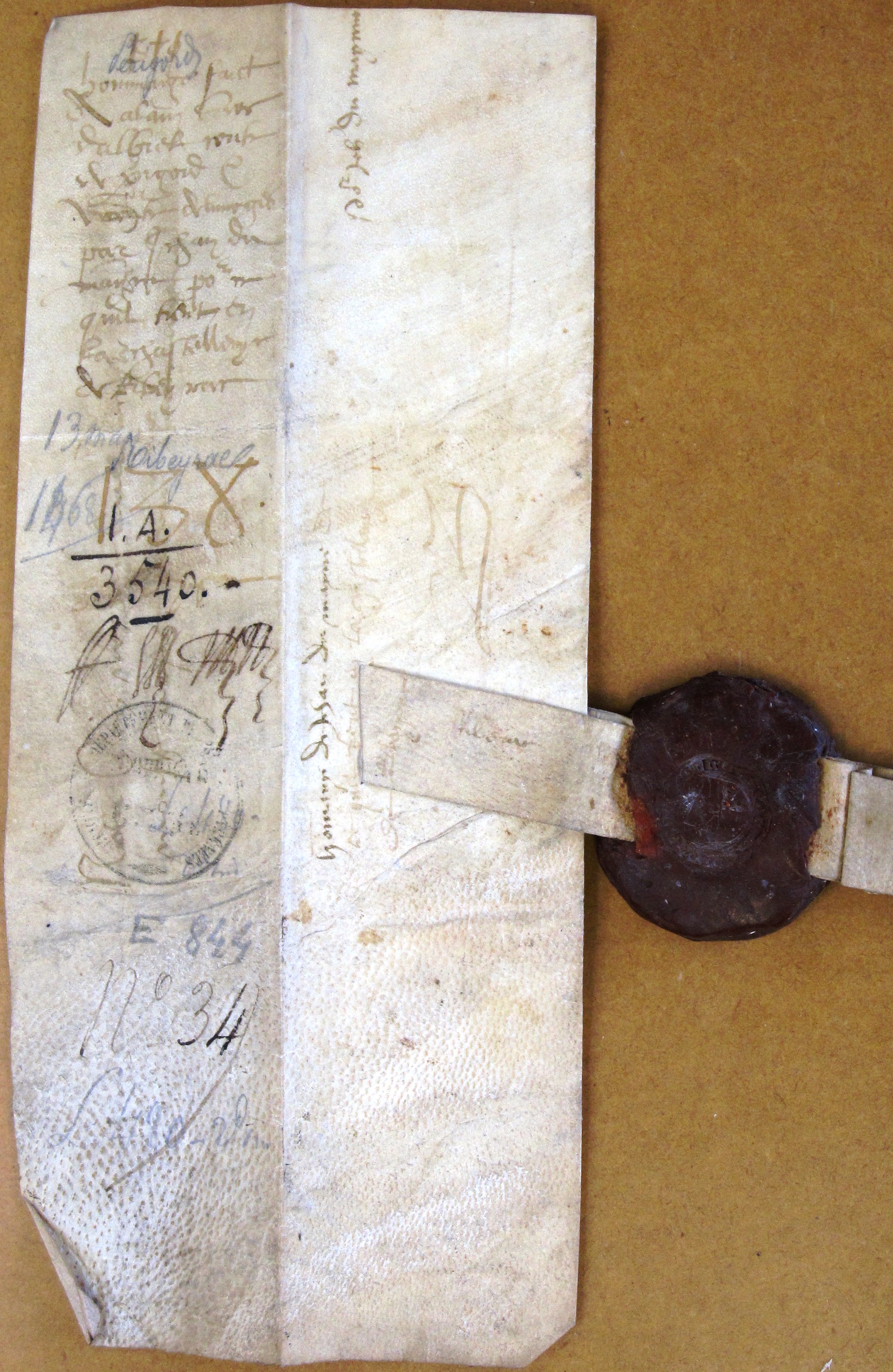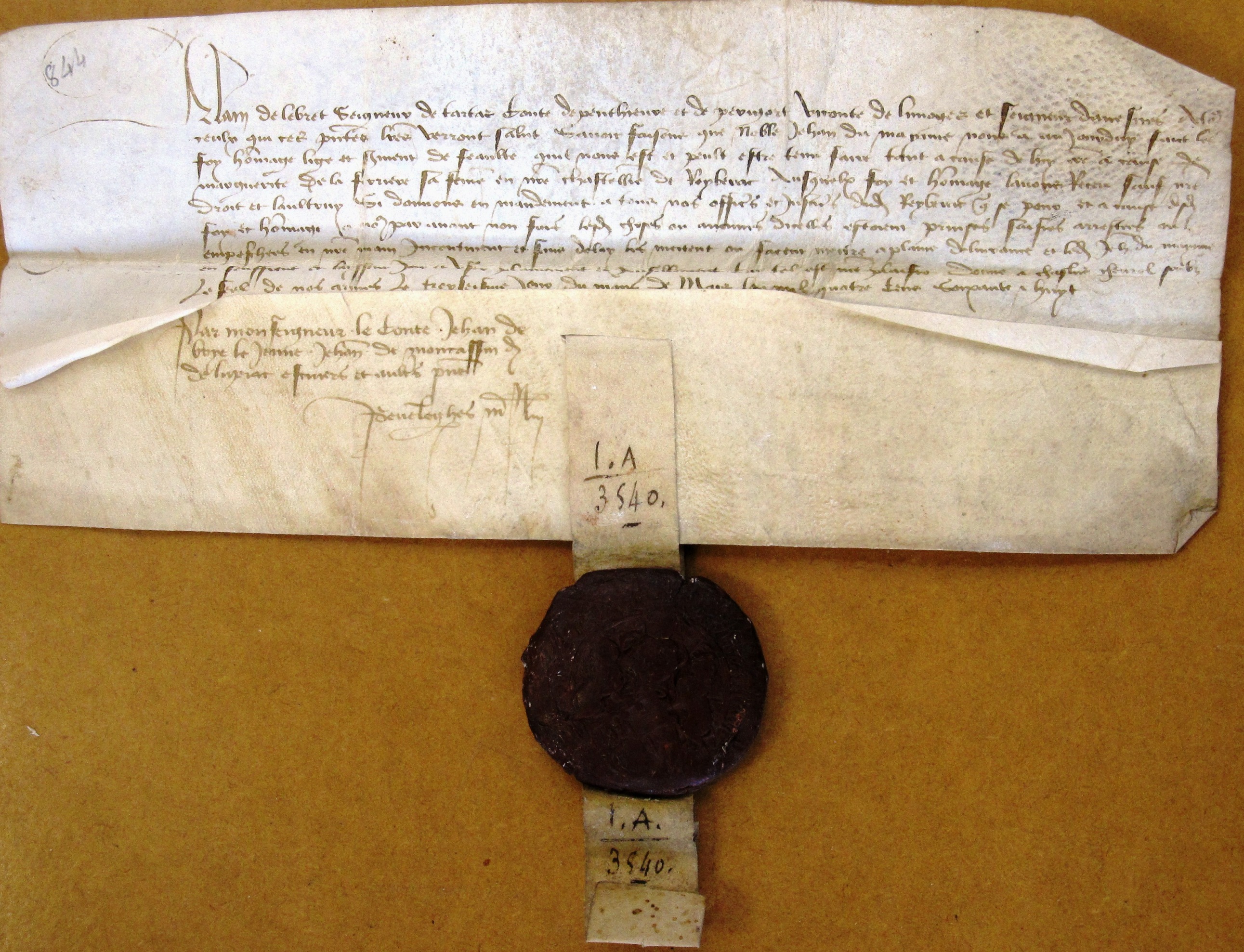 Hommage rendu à Alain d'Albret par Jean Du Maine, au nom de Marguerite de La Ferrière, sa femme, pour les biens qu'elle possédait dans la châtellenie de Ribérac (1468).