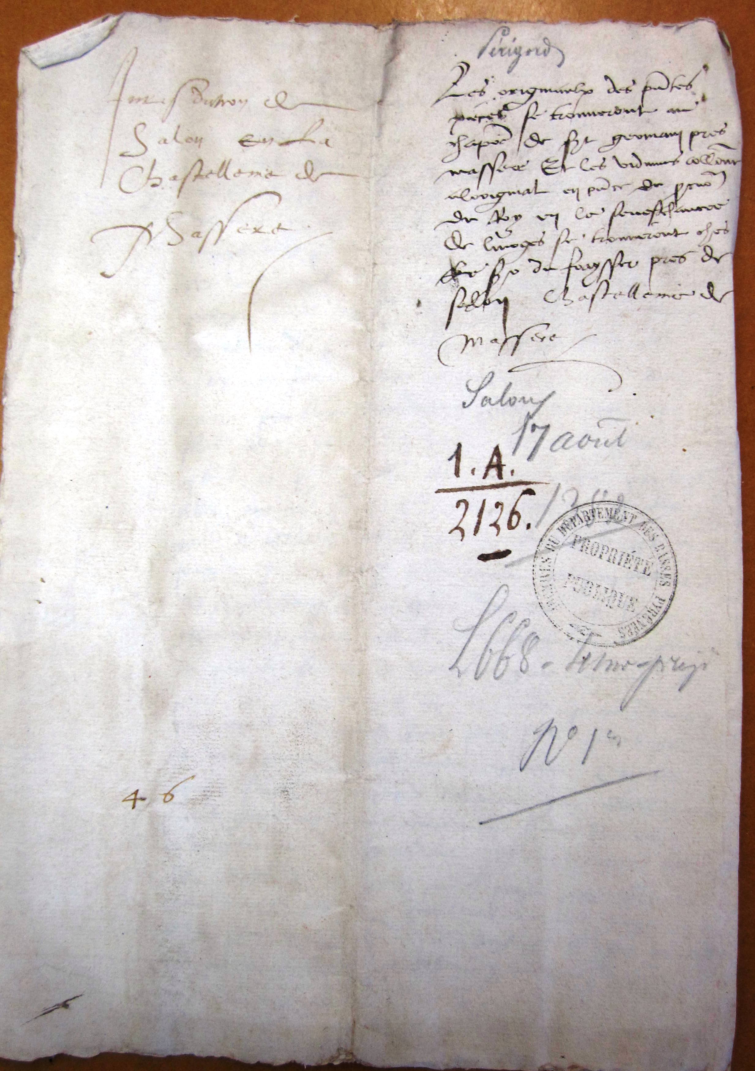 Lettres de Jeanne, duchesse de Bretagne concernant Salon et la châtellenie de Masseré (1382) (vidimus du XVème s.).