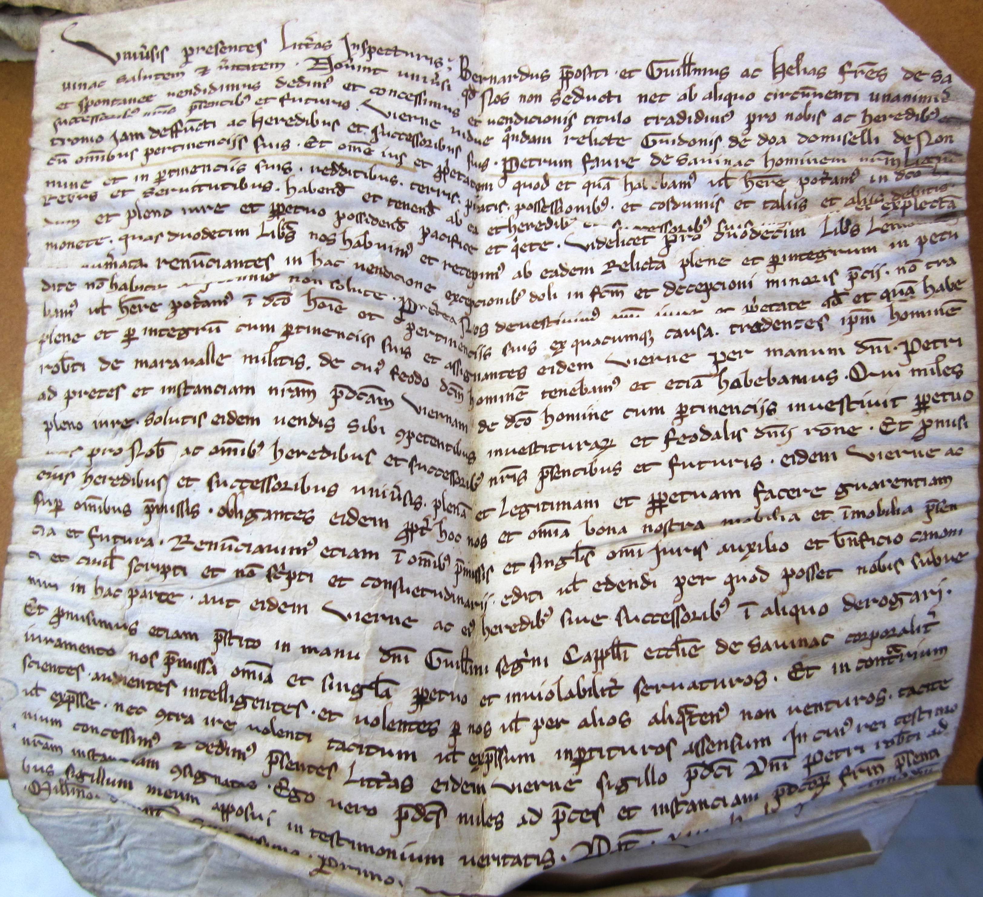 Bernard, Guillaume et Hélie Prévôt, de Savignac, vendent à Vierne, veuve de Gui de Doue, écuyer, de Nontron, Pierre Faure, leur homme-lige, avec tous les biens qu'il possédait à Savignac (1261).