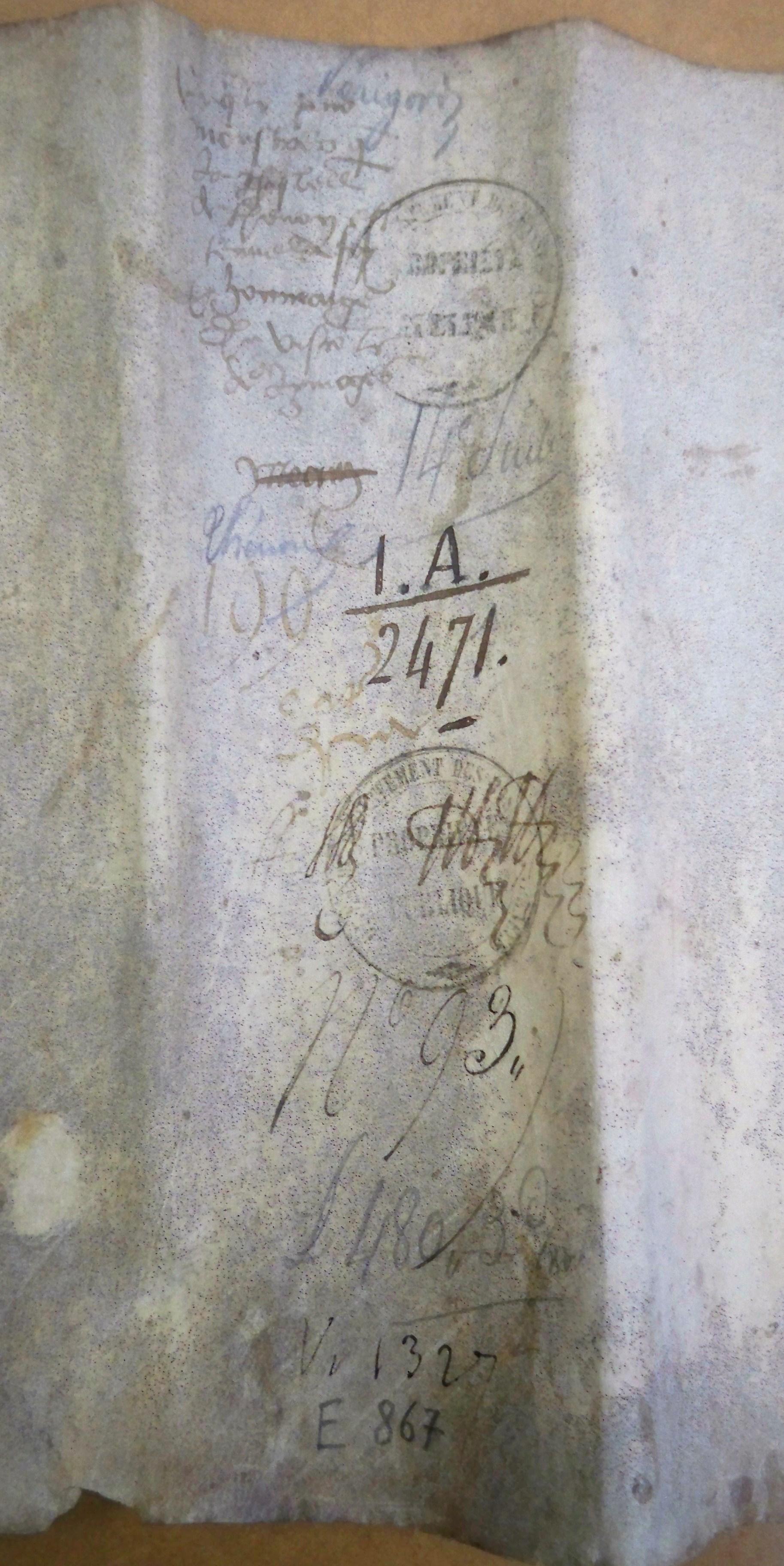 Dépositions des témoins produits dans une enquête faite, sur la demande du vicomte de Limoges, pour établir que la châtellenie de Thenon était vassale de la vicomté de Limoges ; témoins : Guillaume La Marche, écuyer; Géraud La Cropte ; Guillaume Blanc ; Bernard Du Chayron, moine ; Audoin Du Breuil ; Hélie Fromage ; Bernard Molinier ; Pierre La Faye ; Itier de Faye, écuyer; Gui de Galle; etc (1327).