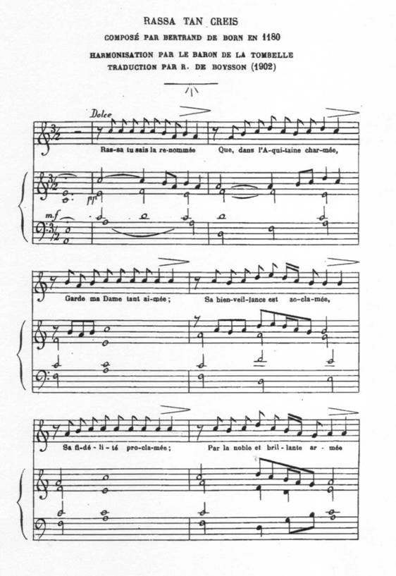 Rassa, ta sais la renommée Que, dans l'Aquitaine charmée, Garde ma Dame tant aimée ; Sa bienveillance est acclamée, Sa fidélité proclamée Par la noble et brillante armée Des plus magnifiques seigneurs. Tous ambitionnent ses faveurs ; Elle repousse leurs honneurs. Celle qui gagne ainsi les cœurs Ne veut pas deux adorateurs. |
