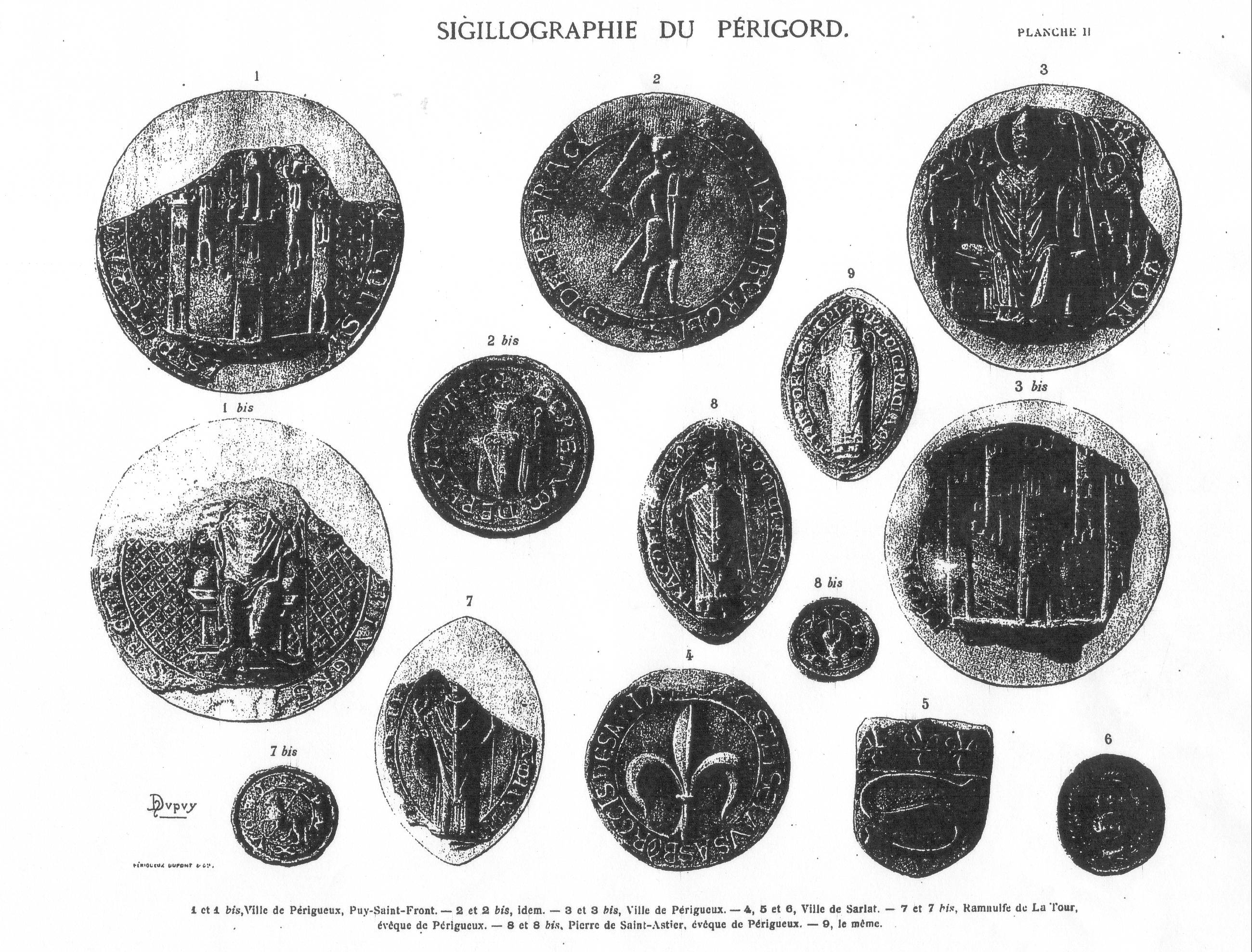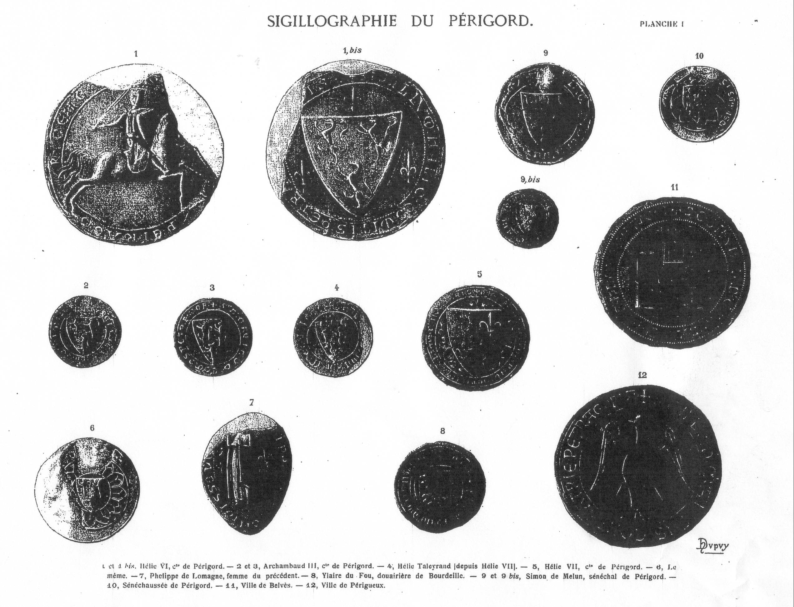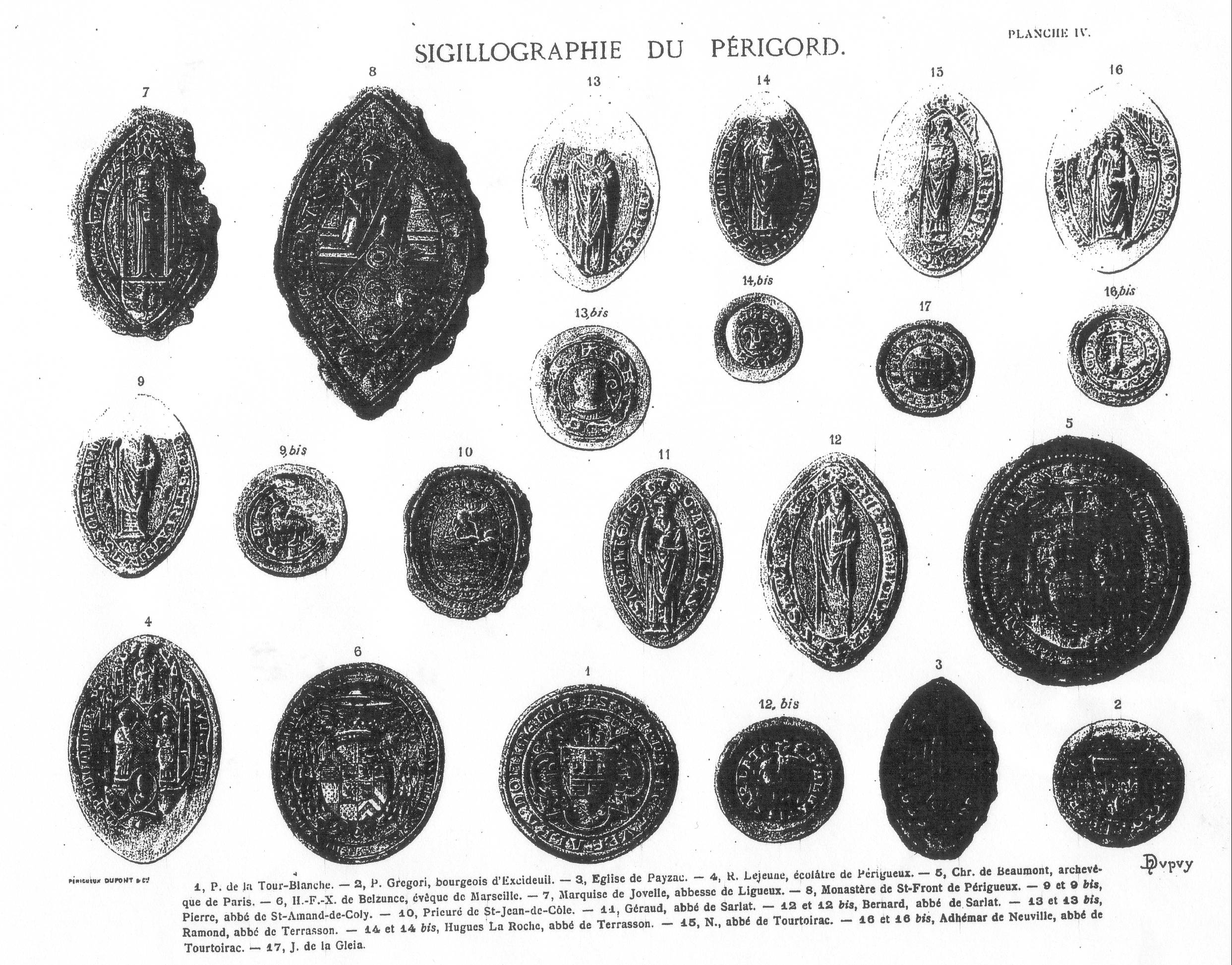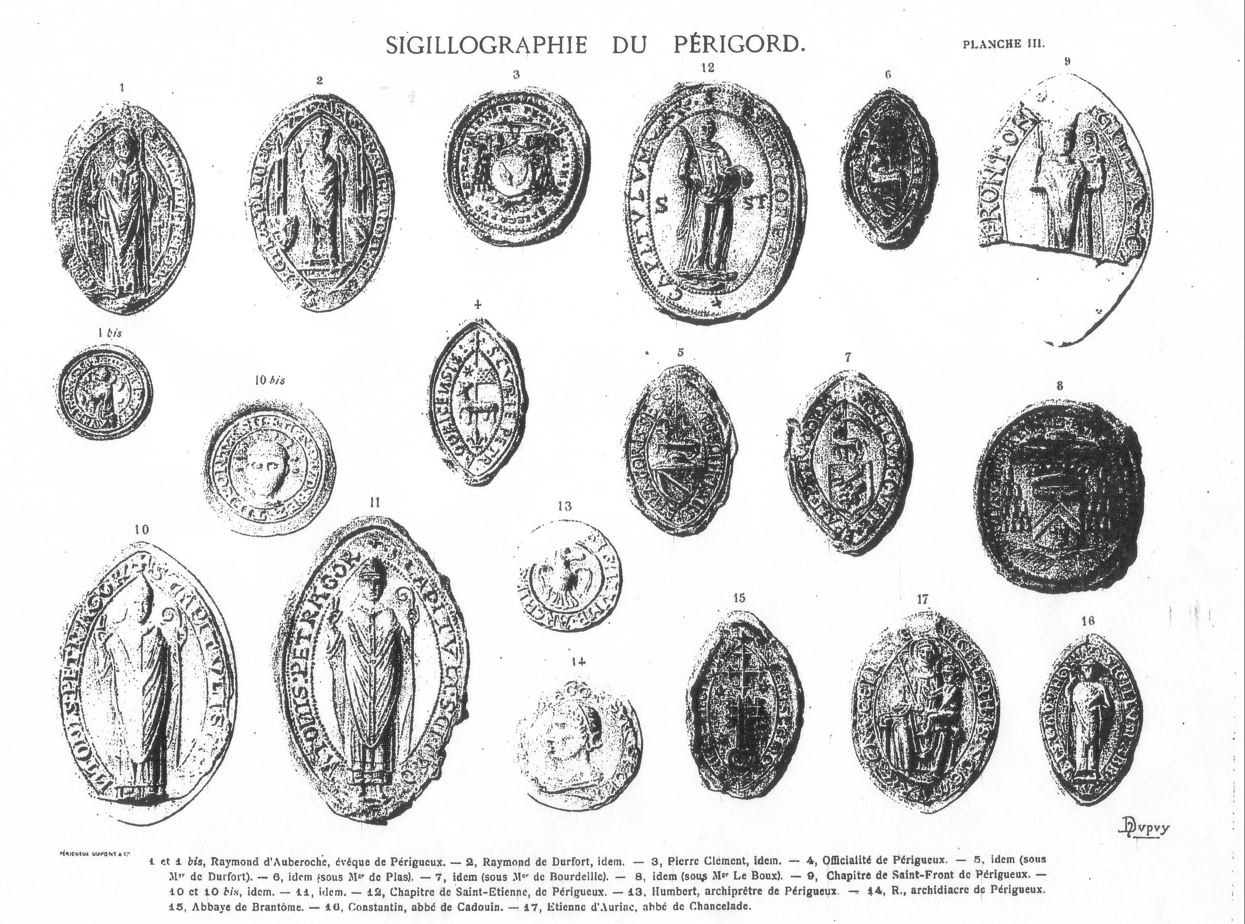 (1) M. Hippolyte Dupuy, qui fait partie de la Société historique et archéologique du Périgord, a été chargé par elle de lithographier les sceaux du Musée de Périgueux et ceux dont j'ai pu me procurer des empreintes ou des moulages ; il a apporté à cette tâche, avec le talent du dessinateur, l'exactitude et le soin d'un archéologue.