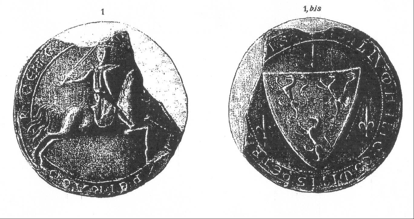 Dessin. — Cavalier à droite, vêtu d'une cotte de mailles et d'une robe dessus, l'épée à la main ; bouclier chargé de trois lions couronnés, posés 2 et 1 ; housse du cheval aux mêmes armes.