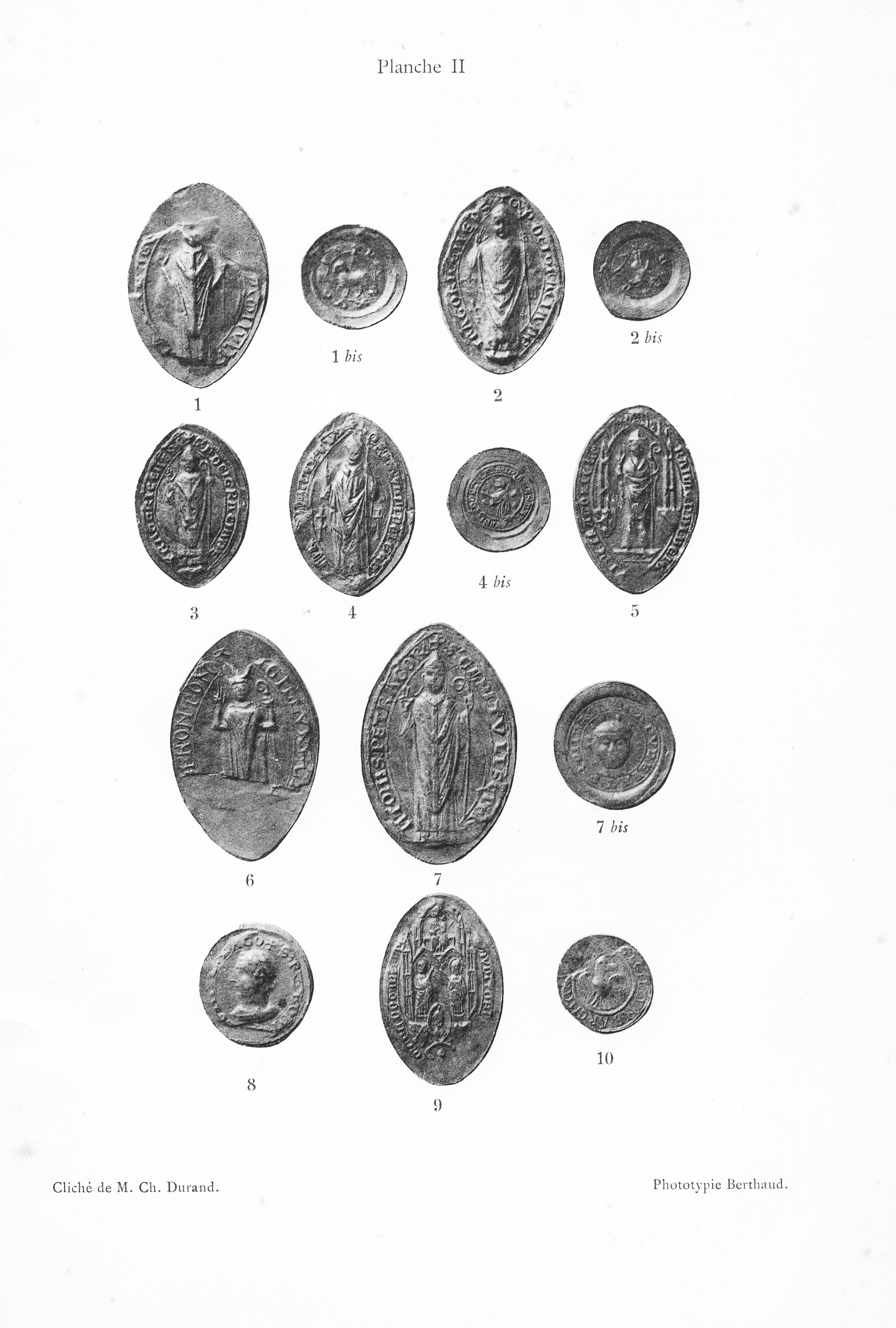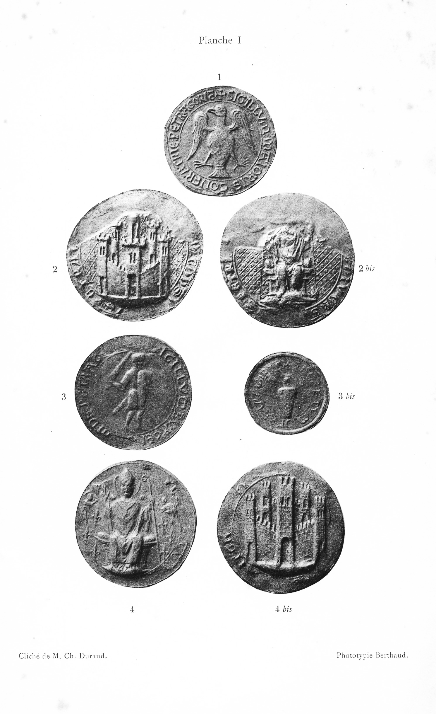 [795] Nous avons suivi l'ordre de l'Inventaire de Douët d'Arcq. Sur la planche I, les sceaux numérotés 1, 3, 3 bis, 4 et 4 bis (sceaux du Bourg du Puy-Saint-Froat) auraient dû, logiquement, précéder le sceau numéroté 2 et 2 bis (sceau de Périgueux).