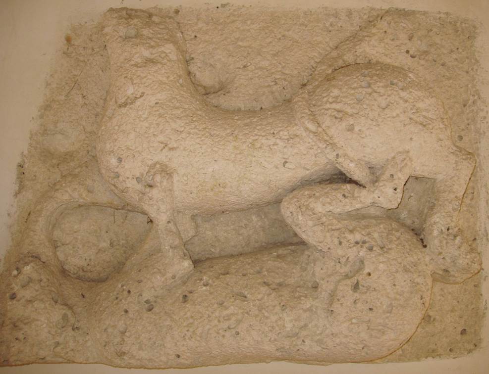 -        une sculpture représentant deux félins tête-bêche, qui se trouvait dans le mur « informe » de l’entrée de l’église, avant la construction du campanile vers 1885, et placés alors dans ce vestibule gauche de l’église.