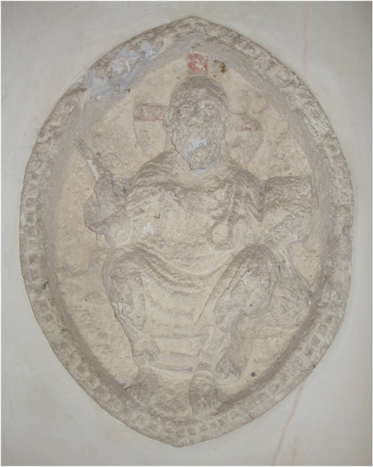 -        un Christ en majesté sculpté dans un décor ovale, portant des traces de polychromie, et provenant de même de l’ancien mur d’entrée.